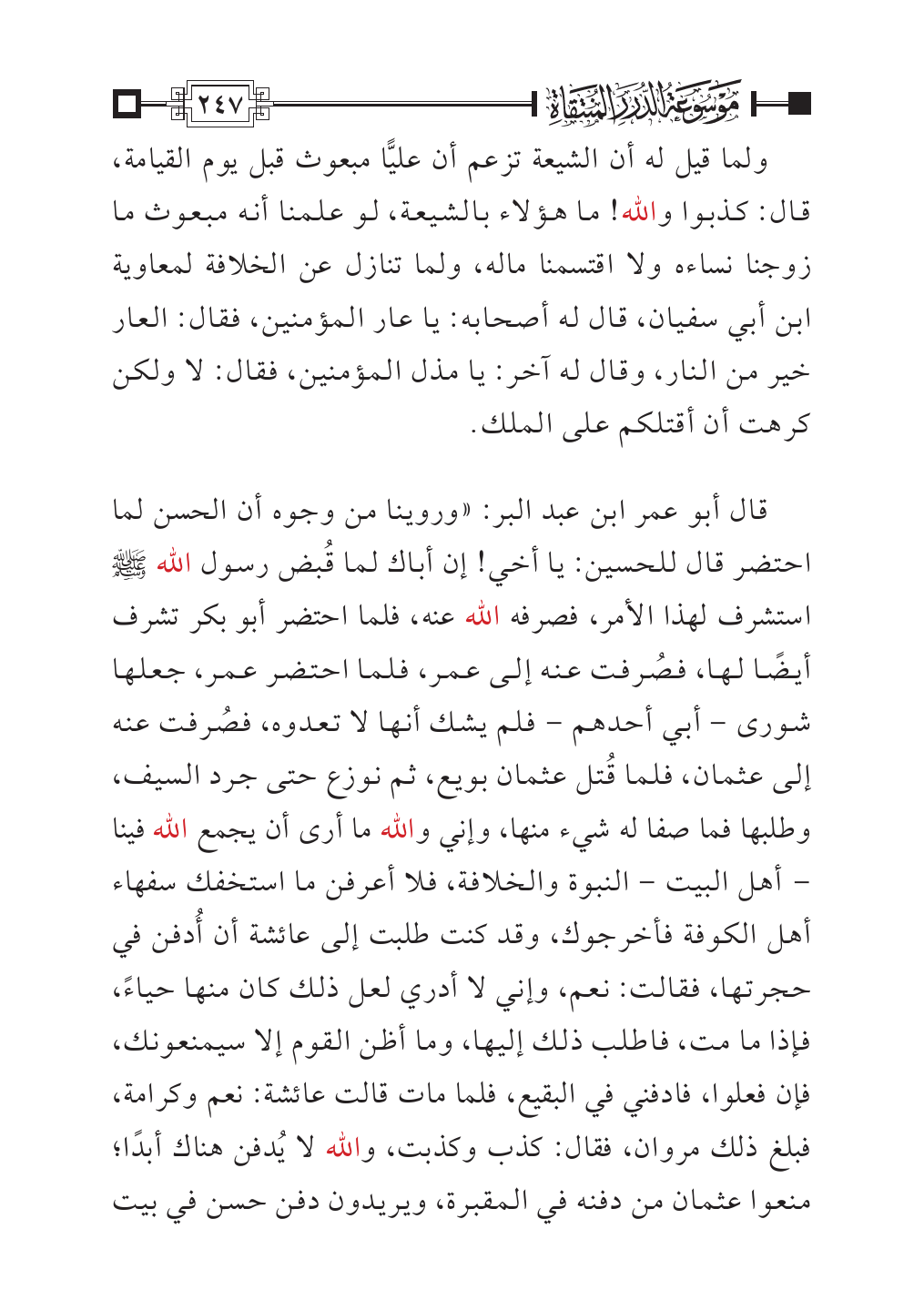 قال أبو عمر ابن عبد البر: «وروينا من وجوه أن الحسن لما احتضر قال للحسين: يا أخي! إن أباك لما قُبض رسول الله - صلى الله عليه وسلم - استشرف لهذا الأمر، فصرفه الله عنه، فلما احتضر أبو بكر تشرف أيضًا لها، فصُرفت عنه إلى عمر، فلما احتضر عمر، جعلها شورى - أبي أحدهم - فلم يشك أنها لا تعدوه، فصُرفت عنه إلى عثمان، فلما قُتل عثمان بويع، ثم نوزع حتى جرد السيف، وطلبها فما صفا له شيء منها، وإني والله ما أرى أن يجمع الله فينا - أهل البيت - النبوة والخلافة، فلا أعرفن ما استخفك سفهاء أهل الكوفة فأخرجوك، وقد كنت طلبت إلى عائشة أن أُدفن في حجرتها، فقالت: نعم، وإني لا أدري لعل ذلك كان منها حياءً، فإذا ما مت، فاطلب ذلك إليها، وما أظن القوم إلا سيمنعونك، فإن فعلوا، فادفني في البقيع، فلما مات قالت عائشة: نعم وكرامة، فبلغ ذلك مروان، فقال: كذب وكذبت، والله لا يُدفن هناك أبدًا؛ منعوا عثمان من دفنه في المقبرة، ويريدون دفن حسن في بيت