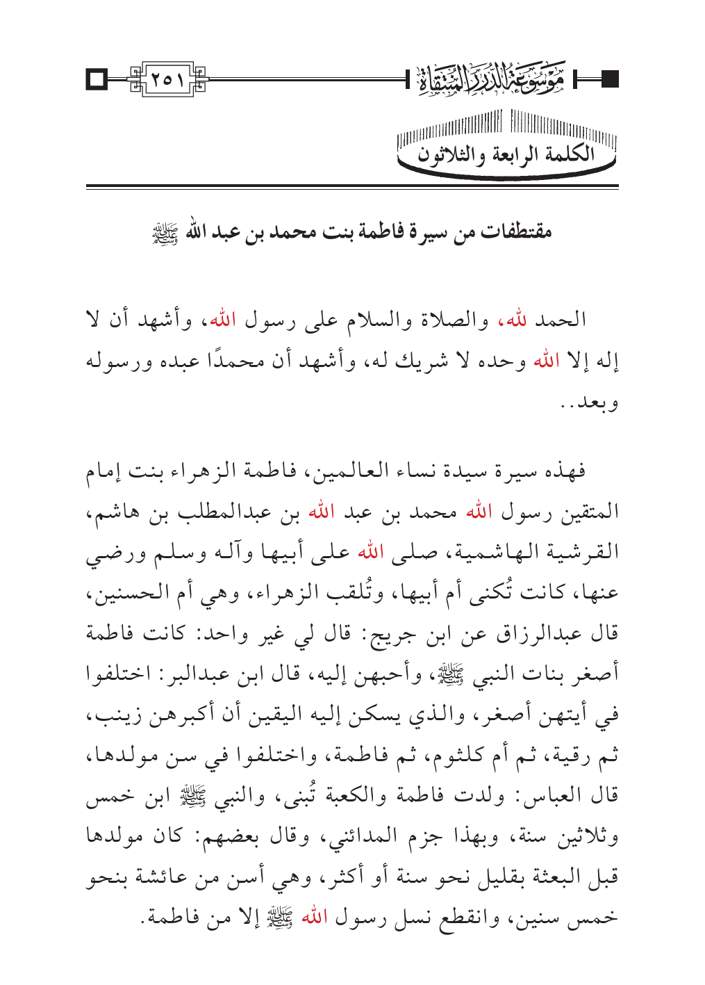 فهذه سيرة سيدة نساء العالمين، فاطمة الزهراء بنت إمام المتقين رسول الله محمد بن عبد الله بن عبدالمطلب بن هاشم، القرشية الهاشمية، صلى الله على أبيها وآله وسلم ورضي عنها، كانت تُكنى أم أبيها، وتُلقب الزهراء، وهي أم الحسنين، قال عبدالرزاق عن ابن جريج: قال لي غير واحد: كانت فاطمة أصغر بنات النبي - صلى الله عليه وسلم -، وأحبهن إليه، قال ابن عبدالبر: اختلفوا في أيتهن أصغر، والذي يسكن إليه اليقين أن أكبرهن زينب، ثم رقية، ثم أم كلثوم، ثم فاطمة، واختلفوا في سن مولدها، قال العباس: ولدت فاطمة والكعبة تُبنى، والنبي - صلى الله عليه وسلم - ابن خمس وثلاثين سنة، وبهذا جزم المدائني، وقال بعضهم: كان مولدها قبل البعثة بقليل نحو سنة أو أكثر، وهي أسن من عائشة بنحو خمس سنين، وانقطع نسل رسول الله - صلى الله عليه وسلم - إلا من فاطمة.