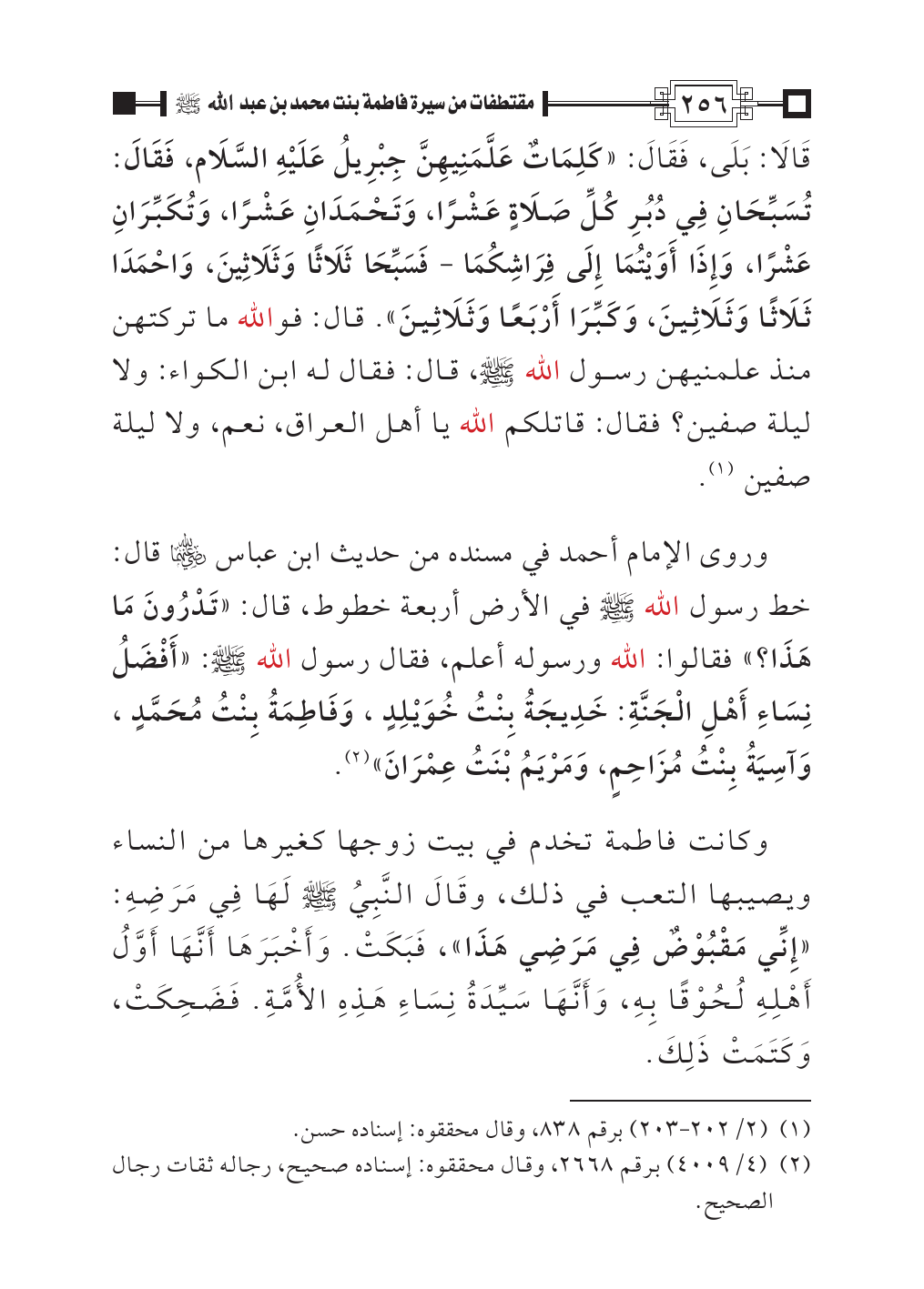 وروى الإمام أحمد في مسنده من حديث ابن عباس - رضي الله عنهما - قال: خط رسول الله - صلى الله عليه وسلم - في الأرض أربعة خطوط، قال: «تَدْرُونَ مَا هَذَا؟» فقالوا: الله ورسوله أعلم، فقال رسول الله - صلى الله عليه وسلم -: «أَفْضَلُ نِسَاءِ أَهْلِ الْجَنَّةِ: خَدِيجَةُ بِنْتُ خُوَيْلِدٍ، وَفَاطِمَةُ بِنْتُ مُحَمَّدٍ، وَآسِيَةُ بِنْتُ مُزَاحِمٍ، وَمَرْيَمُ بْنَتُ عِمْرَانَ» (¬٢).