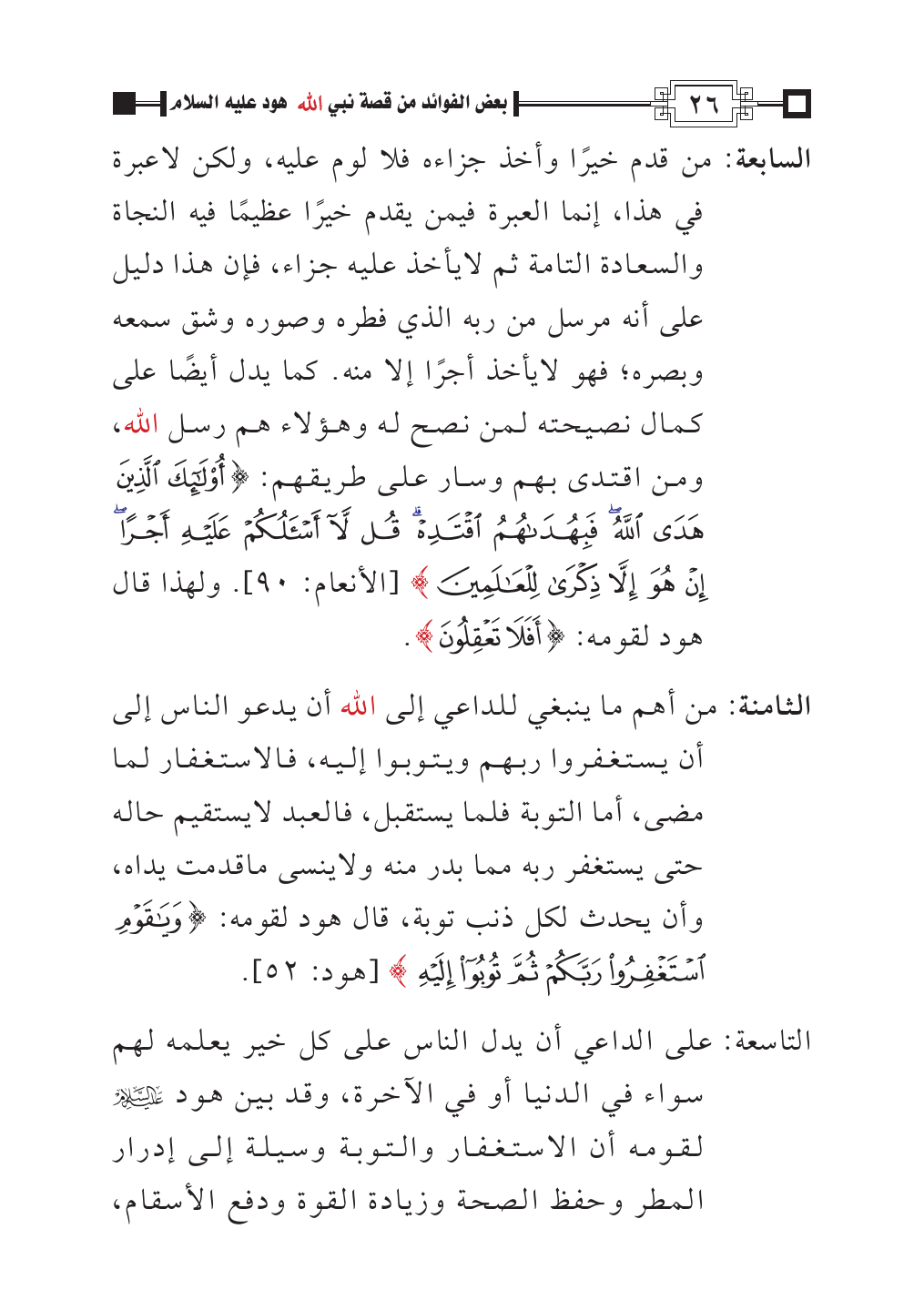 التاسعة: على الداعي أن يدل الناس على كل خير يعلمه لهم سواء في الدنيا أو في الآخرة، وقد بين هود - عليه السلام -لقومه أن الاستغفار والتوبة وسيلة إلى إدرار المطر وحفظ الصحة وزيادة القوة ودفع الأسقام،