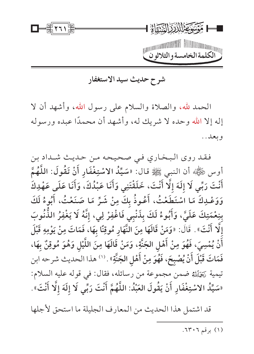 فقد روى البخاري في صحيحه من حديث شداد بن أوس - رضي الله عنه - أن النبي - صلى الله عليه وسلم - قال: «سَيِّدُ الاسْتِغْفَارِ أَنْ تَقُولَ: اللَّهُمَّ أَنْتَ رَبِّي لَا إِلَهَ إِلَّا أَنْتَ، خَلَقْتَنِي وَأَنَا عَبْدُكَ، وَأَنَا عَلَى عَهْدِكَ وَوَعْدِكَ مَا اسْتَطَعْتُ، أَعُوذُ بِكَ مِنْ شَرِّ مَا صَنَعْتُ، أَبُوءُ لَكَ بِنِعْمَتِكَ عَلَيَّ، وَأَبُوءُ لَكَ بِذَنْبِي فَاغْفِرْ لِي، إِنَّهُ لَا يَغْفِرُ الذُّنُوبَ إِلَّا أَنْتَ». قَالَ: «وَمَنْ قَالَهَا مِنَ النَّهَارِ مُوقِنًا بِهَا، فَمَاتَ مِنْ يَوْمِهِ قَبْلَ أَنْ يُمْسِيَ، فَهُوَ مِنْ أَهْلِ الجَنَّةِ، وَمَنْ قَالَهَا مِنَ اللَّيْلِ وَهُوَ مُوقِنٌ بِهَا، فَمَاتَ قَبْلَ أَنْ يُصْبِحَ، فَهُوَ مِنْ أَهْلِ الجَنَّةِ». (¬١) هذا الحديث شرحه ابن تيمية - رحمه الله - ضمن مجموعة من رسائله، فقال: في قوله - عليه السلام -: «سَيِّدُ الاسْتِغْفَارِ أَنْ يَقُولَ العَبْدُ: اللَّهُمَّ أَنْتَ رَبِّي لَا إِلَهَ إِلَّا أَنْتَ».