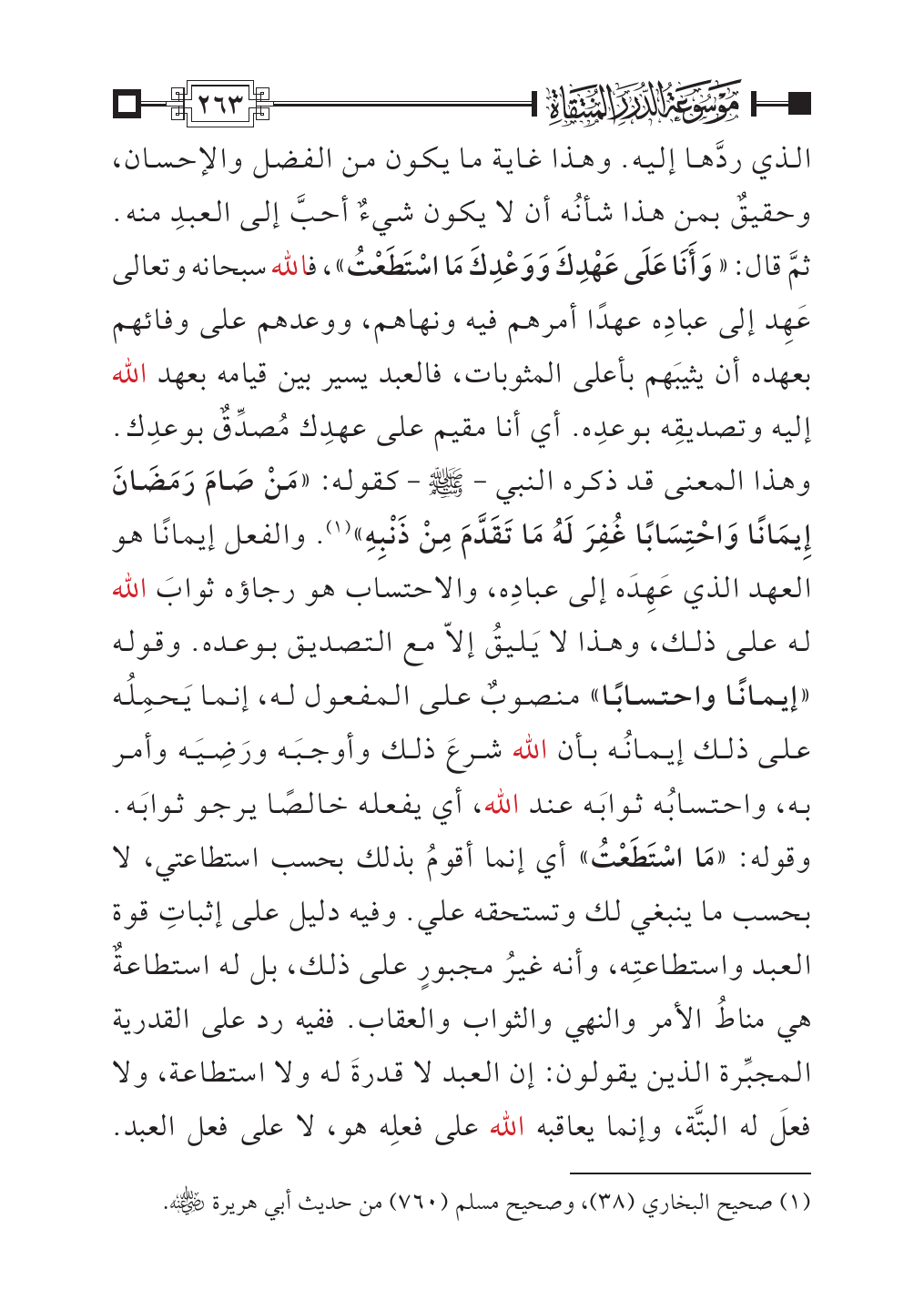 وقوله: «مَا اسْتَطَعْتُ» أي إنما أقومُ بذلك بحسب استطاعتي، لا بحسب ما ينبغي لك وتستحقه علي. وفيه دليل على إثباتِ قوة العبد واستطاعتِه، وأنه غيرُ مجبورٍ على ذلك، بل له استطاعةٌ هي مناطُ الأمر والنهي والثواب والعقاب. ففيه رد على القدرية المجبِّرة الذين يقولون: إن العبد لا قدرةَ له ولا استطاعة، ولا فعلَ له البتَّة، وإنما يعاقبه الله على فعلِه هو، لا على فعل العبد.