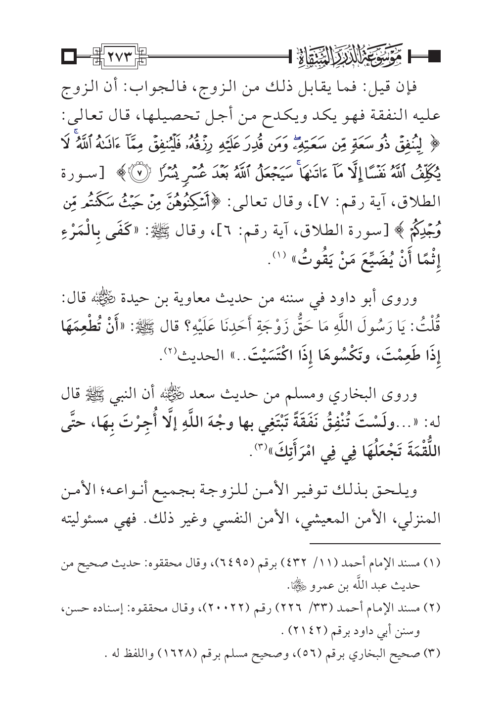 ويلحق بذلك توفير الأمن للزوجة بجميع أنواعه؛ الأمن المنزلي، الأمن المعيشي، الأمن النفسي وغير ذلك. فهي مسئوليته