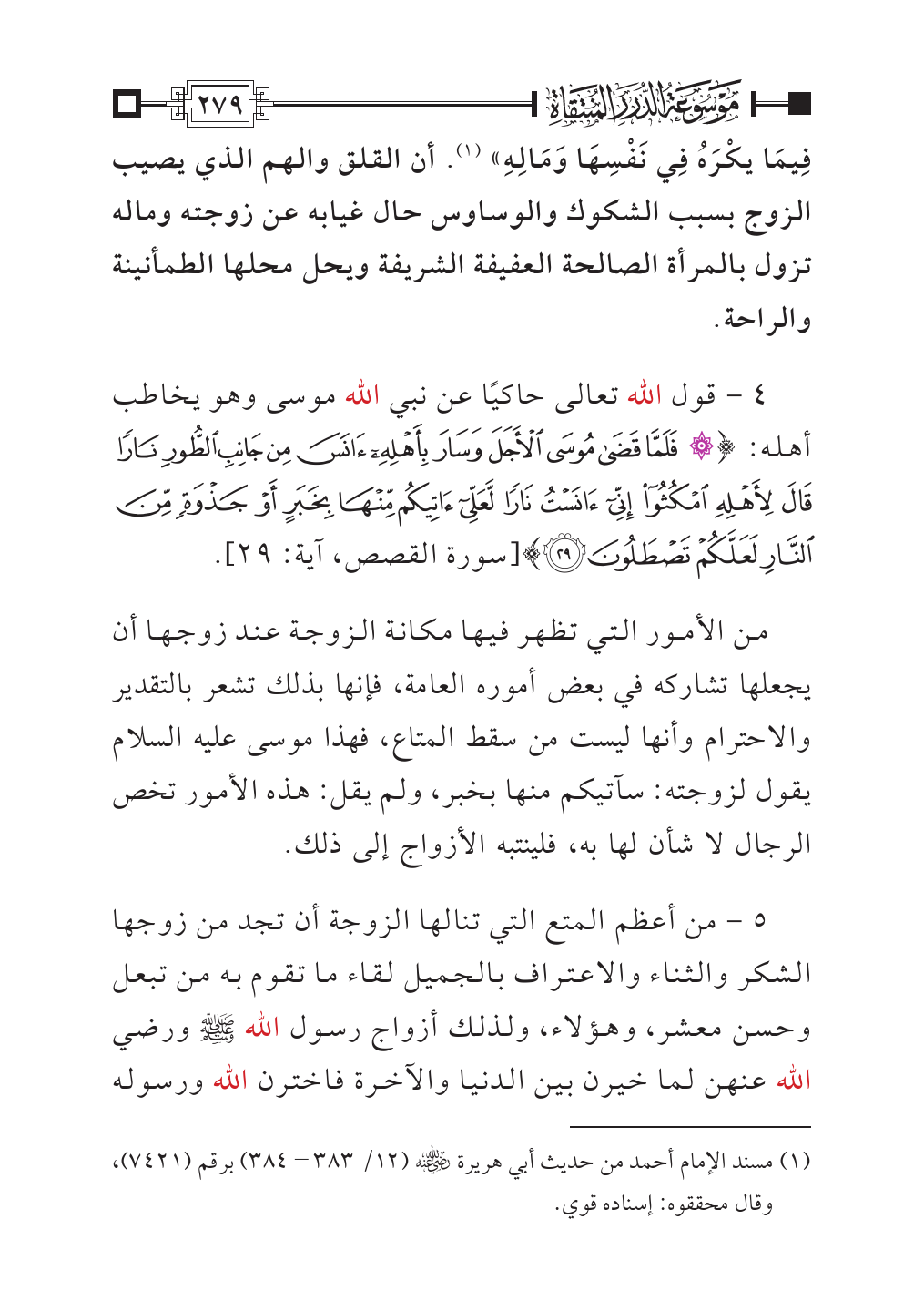 فِيمَا يكْرَهُ فِي نَفْسِهَا وَمَالِهِ» (¬١). أن القلق والهم الذي يصيب الزوج بسبب الشكوك والوساوس حال غيابه عن زوجته وماله تزول بالمرأة الصالحة العفيفة الشريفة ويحل محلها الطمأنينة والراحة.