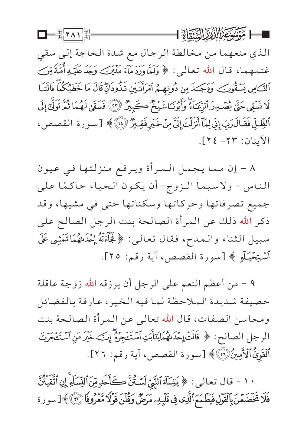 ٩ - من أعظم النعم على الرجل أن يرزقه الله زوجة عاقلة حصيفة شديدة الملاحظة لما فيه الخير، عارفة بالفضائل ومحاسن الصفات، قال الله تعالى عن المرأة الصالحة بنت الرجل الصالح: {قَالَتْ إِحْدَاهُمَا يَاأَبَتِ اسْتَأْجِرْهُ إِنَّ خَيْرَ مَنِ اسْتَأْجَرْتَ الْقَوِيُّ الْأَمِينُ (٢٦)} [سورة القصص، آية رقم: ٢٦].