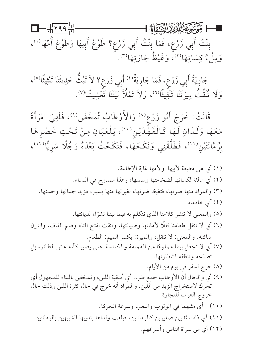 جَارِيَةُ أَبِي زَرْعٍ، فَمَا جَارِيَةُ (¬٤) أَبِي زَرْعٍ؟ لَا تَبُثُّ حَدِيثَنَا تَبْثِيثًا (¬٥)، وَلَا تُنَقِّثُ مِيرَتَنَا تَنْقِيثًا (¬٦)، وَلَا تَمْلَأُ بَيْتَنَا تَعْشِيشًا (¬٧).