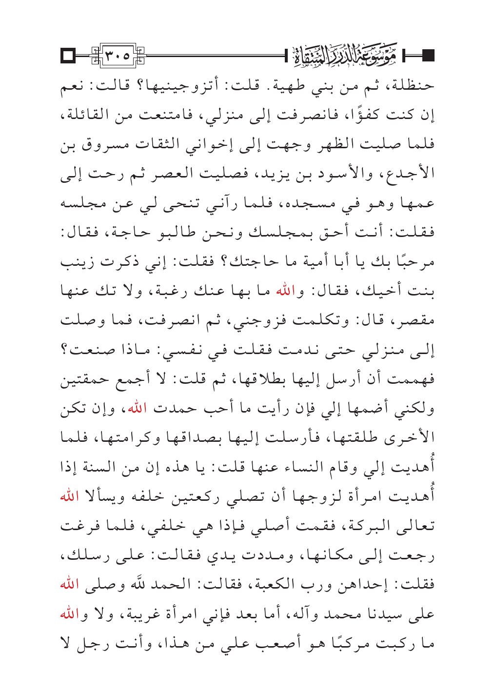 حنظلة، ثم من بني طهية. قلت: أتزوجينيها؟ قالت: نعم إن كنت كفؤًا، فانصرفت إلى منزلي، فامتنعت من القائلة، فلما صليت الظهر وجهت إلى إخواني الثقات مسروق بن الأجدع، والأسود بن يزيد، فصليت العصر ثم رحت إلى عمها وهو في مسجده، فلما رآني تنحى لي عن مجلسه فقلت: أنت أحق بمجلسك ونحن طالبو حاجة، فقال: مرحبًا بك يا أبا أمية ما حاجتك؟ فقلت: إني ذكرت زينب بنت أخيك، فقال: والله ما بها عنك رغبة، ولا تك عنها مقصر، قال: وتكلمت فزوجني، ثم انصرفت، فما وصلت إلى منزلي حتى ندمت فقلت في نفسي: ماذا صنعت؟ فهممت أن أرسل إليها بطلاقها، ثم قلت: لا أجمع حمقتين ولكني أضمها إلي فإن رأيت ما أحب حمدت الله، وإن تكن الأخرى طلقتها، فأرسلت إليها بصداقها وكرامتها، فلما أُهديت إلي وقام النساء عنها قلت: يا هذه إن من السنة إذا أُهديت امرأة لزوجها أن تصلي ركعتين خلفه ويسألا الله تعالى البركة، فقمت أصلي فإذا هي خلفي، فلما فرغت رجعت إلى مكانها، ومددت يدي فقالت: على رسلك، فقلت: إحداهن ورب الكعبة، فقالت: الحمد للَّه وصلى الله على سيدنا محمد وآله، أما بعد فإني امرأة غريبة، ولا والله ما ركبت مركبًا هو أصعب علي من هذا، وأنت رجل لا