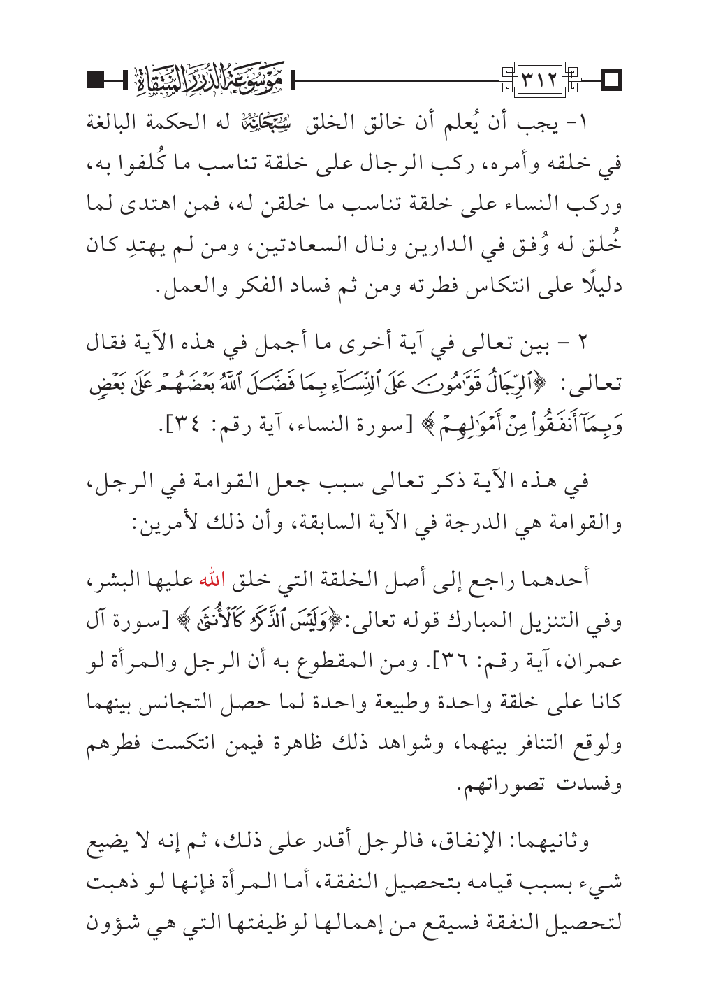 ٢ - بين تعالى في آية أخرى ما أجمل في هذه الآية فقال تعالى: {الرِّجَالُ قَوَّامُونَ عَلَى النِّسَاءِ بِمَا فَضَّلَ اللَّهُ بَعْضَهُمْ عَلَى بَعْضٍ وَبِمَا أَنْفَقُوا مِنْ أَمْوَالِهِمْ} [سورة النساء، آية رقم: ٣٤].
