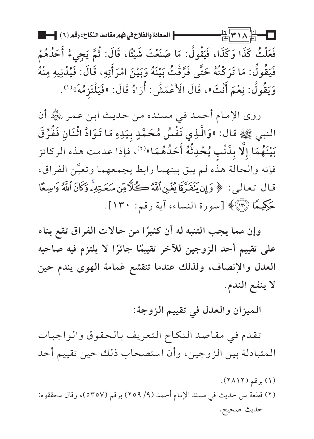 روى الإمام أحمد في مسنده من حديث ابن عمر - رضي الله عنهما - أن النبي - صلى الله عليه وسلم - قال: «وَالَّذِي نَفْسُ مُحَمَّدٍ بِيَدِهِ مَا تَوَادَّ اثْنَانِ فَفُرِّقَ بَيْنَهُمَا إِلَّا بِذَنْبٍ يُحْدِثُهُ أَحَدُهُمَا» (¬٢)، فإذا عدمت هذه الركائز فإنه والحالة هذه لم يبق بينهما رابط يجمعهما وتعيَّن الفراق، قال تعالى: {وَإِنْ يَتَفَرَّقَا يُغْنِ اللَّهُ كُلًّا مِنْ سَعَتِهِ وَكَانَ اللَّهُ وَاسِعًا حَكِيمًا (١٣٠)} [سورة النساء، آية رقم: ١٣٠].