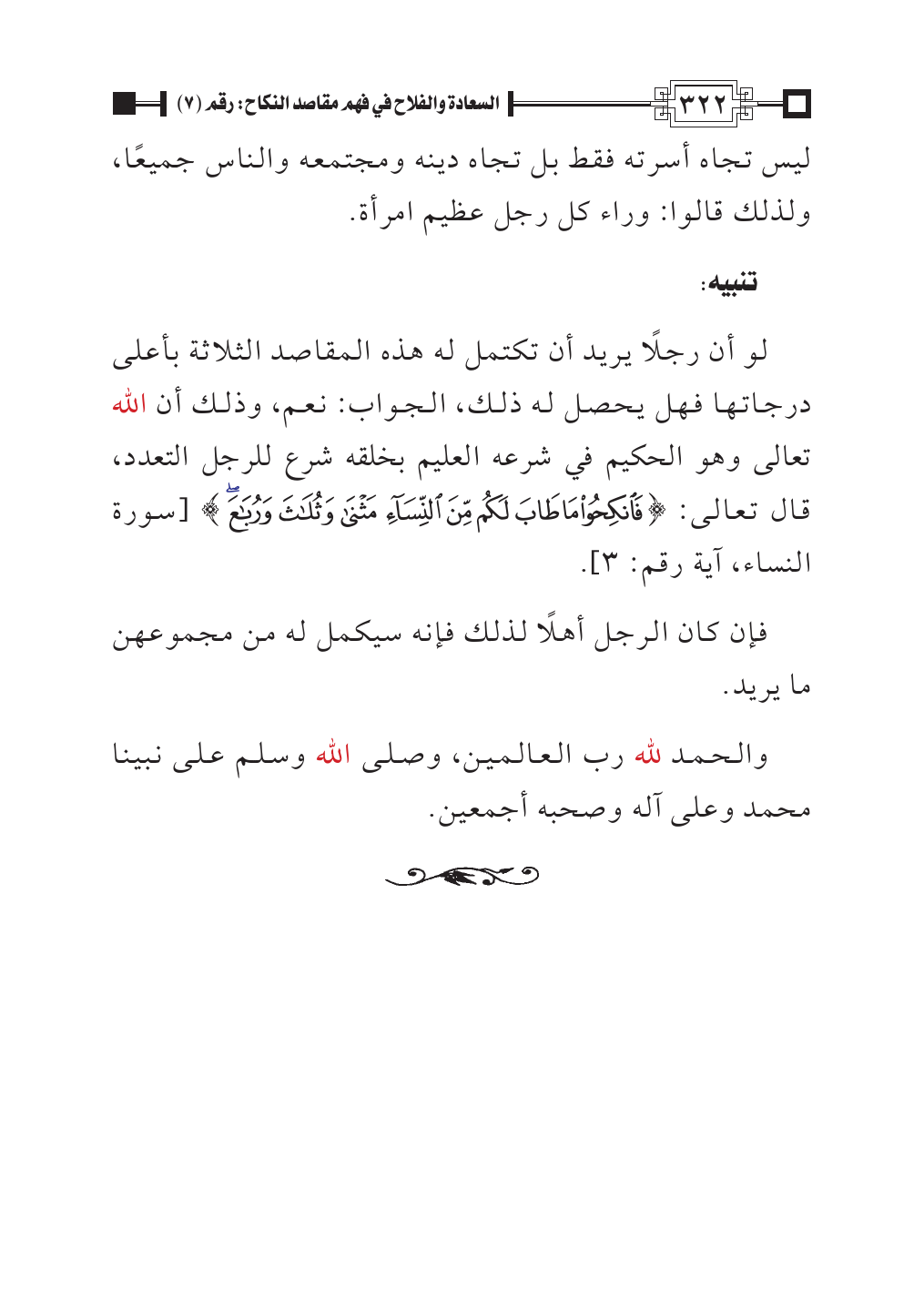 لو أن رجلًا يريد أن تكتمل له هذه المقاصد الثلاثة بأعلى درجاتها فهل يحصل له ذلك، الجواب: نعم، وذلك أن الله تعالى وهو الحكيم في شرعه العليم بخلقه شرع للرجل التعدد، قال تعالى: {فَانْكِحُوا مَا طَابَ لَكُمْ مِنَ النِّسَاءِ مَثْنَى وَثُلَاثَ وَرُبَاعَ} [سورة النساء، آية رقم: ٣].