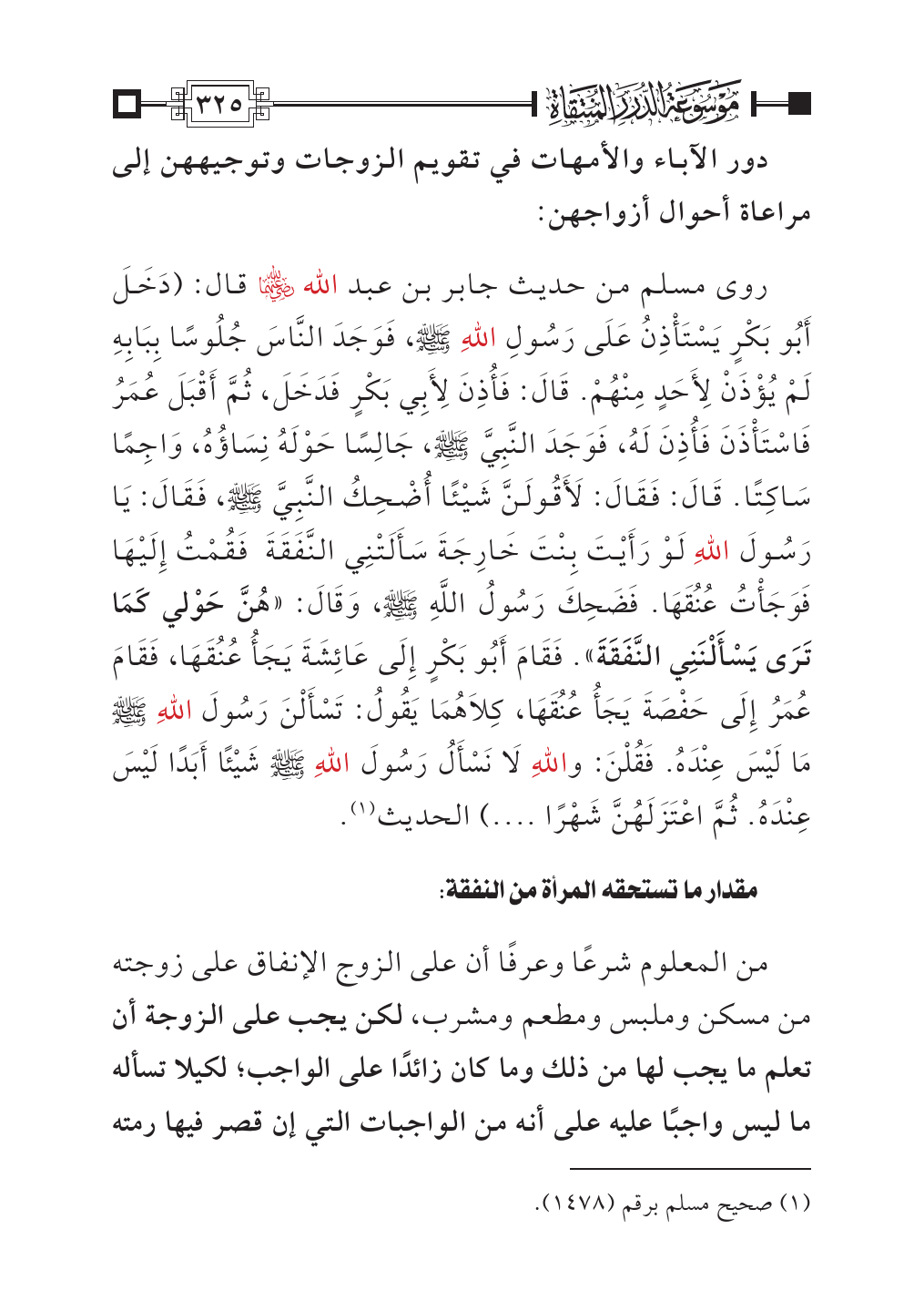 روى مسلم من حديث جابر بن عبد الله - عز وجل - قال: (دَخَلَ أَبُو بَكْرٍ يَسْتَأْذِنُ عَلَى رَسُولِ اللهِ - صلى الله عليه وسلم -، فَوَجَدَ النَّاسَ جُلُوسًا بِبَابِهِ لَمْ يُؤْذَنْ لِأَحَدٍ مِنْهُمْ. قَالَ: فَأُذِنَ لِأَبِي بَكْرٍ فَدَخَلَ، ثُمَّ أَقْبَلَ عُمَرُ فَاسْتَأْذَنَ فَأُذِنَ لَهُ، فَوَجَدَ النَّبِيَّ - صلى الله عليه وسلم -، جَالِسًا حَوْلَهُ نِسَاؤُهُ، وَاجِمًا سَاكِتًا. قَالَ: فَقَالَ: لَأَقُولَنَّ شَيْئًا أُضْحِكُ النَّبِيَّ - صلى الله عليه وسلم -، فَقَالَ: يَا رَسُولَ اللهِ لَوْ رَأَيْتَ بِنْتَ خَارِجَةَ سَأَلَتْنِي النَّفَقَةَ فَقُمْتُ إِلَيْهَا فَوَجَأْتُ عُنُقَهَا. فَضَحِكَ رَسُولُ اللَّهِ - صلى الله عليه وسلم -، وَقَالَ: «هُنَّ حَوْلي كَمَا تَرَى يَسْأَلْنَنِي النَّفَقَةَ». فَقَامَ أَبُو بَكْرٍ إِلَى عَائِشَةَ يَجَأُ عُنُقَهَا، فَقَامَ عُمَرُ إِلَى حَفْصَةَ يَجَأُ عُنُقَهَا، كِلَاهُمَا يَقُولُ: تَسْأَلْنَ رَسُولَ اللهِ - صلى الله عليه وسلم - مَا لَيْسَ عِنْدَهُ. فَقُلْنَ: واللهِ لَا نَسْأَلُ رَسُولَ اللهِ - صلى الله عليه وسلم - شَيْئًا أَبَدًا لَيْسَ عِنْدَهُ. ثُمَّ اعْتَزَلَهُنَّ شَهْرًا .... ) الحديث (¬١).