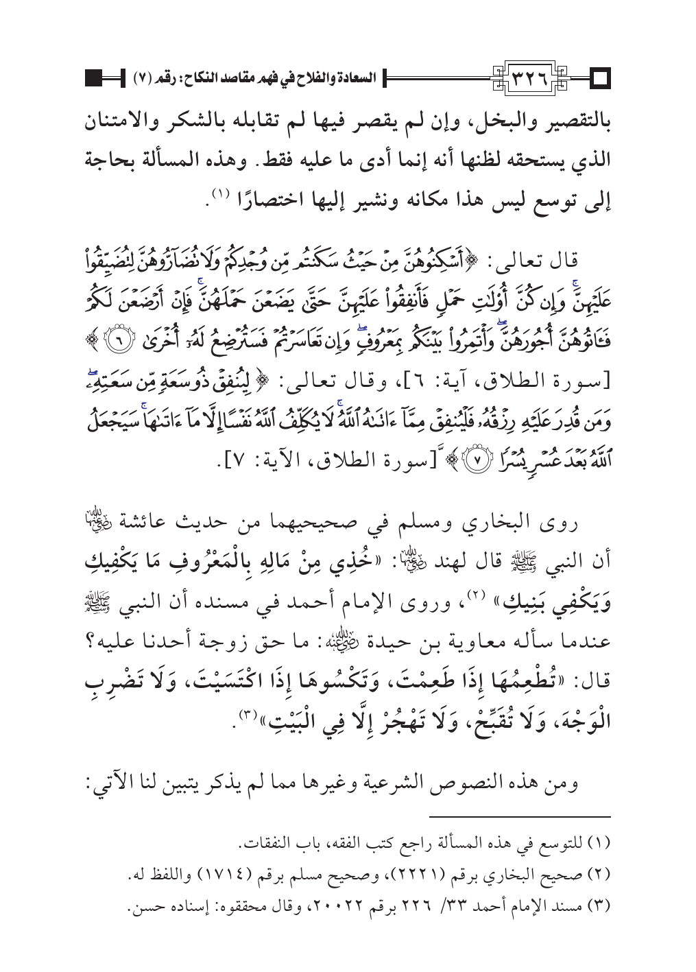 روى البخاري ومسلم في صحيحيهما من حديث عائشة - رضي الله عنها - أن النبي - صلى الله عليه وسلم - قال لهند?: «خُذِي مِنْ مَالِهِ بِالْمَعْرُوفِ مَا يَكْفِيكِ وَيَكْفِي بَنِيكِ» (¬٢)، وروى الإمام أحمد في مسنده أن النبي - صلى الله عليه وسلم - عندما سأله معاوية بن حيدة - رضي الله عنه -: ما حق زوجة أحدنا عليه؟ قال: «تُطْعِمُهَا إِذَا طَعِمْتَ، وَتَكْسُوهَا إِذَا اكْتَسَيْتَ، وَلَا تَضْرِبِ الْوَجْهَ، وَلَا تُقَبِّحْ، وَلَا تَهْجُرْ إِلَّا فِي الْبَيْتِ» (¬٣).