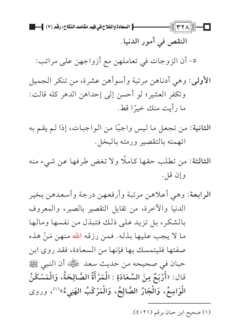 الرابعة: وهي أعلاهن مرتبة وأرفعهن درجة وأسعدهن بخير الدنيا والآخرة، من تقابل التقصير بالصبر، والمعروف بالشكر، بل تزيد على ذلك فتبذل من نفسها ومالها ما لا يجب عليها بذله. فمن رزقه الله منهن مَنْ هذه صفتها فليتمسك بها فإنها من السعادة، فقد روى ابن حبان في صحيحه من حديث سعد - رضي الله عنه - أن النبي - صلى الله عليه وسلم - قال: «أَرْبَعٌ مِنَ السَّعَادَةِ: الْمَرْأَةُ الصَّالِحَةُ، وَالْمَسْكَنُ الْوَاسِعُ، وَالْجَارُ الصَّالِحُ، وَالْمَرْكَبُ الهَنِيءُ» (¬١)، وروى