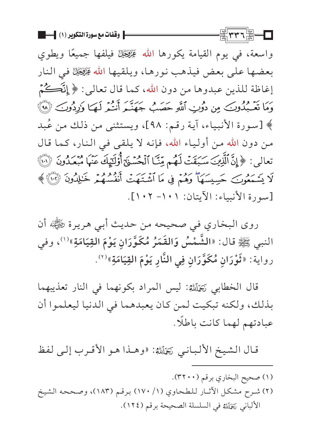 روى البخاري في صحيحه من حديث أبي هريرة - رضي الله عنه - أن النبي - صلى الله عليه وسلم - قال: «الشَّمْسُ وَالقَمَرُ مُكَوَّرَانِ يَوْمَ القِيَامَةِ» (¬١)، وفي رواية: «ثَوْرَانِ مُكَوَّرَانِ فِي النَّارِ يَوْمَ القِيَامَةِ» (¬٢).