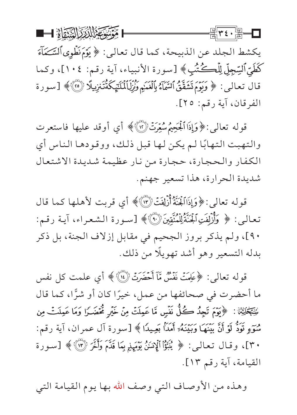 قوله تعالى: {وَإِذَا الْجَنَّةُ أُزْلِفَتْ (١٣)} أي قربت لأهلها كما قال تعالى: {وَأُزْلِفَتِ الْجَنَّةُ لِلْمُتَّقِينَ (٩٠)} [سورة الشعراء، آية رقم: ٩٠]، ولم يذكر بروز الجحيم في مقابل إزلاف الجنة، بل ذكر بدله التسعير وهو أشد تهويلًا من ذلك.