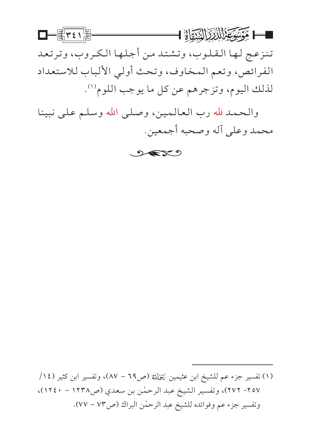 (¬١). تفسير جزء عم للشيخ ابن عثيمين - رحمه الله - (ص ٦٩ - ٨٧)، وتفسير ابن كثير (١٤/ ٢٥٧ - ٢٧٢)، وتفسير الشيخ عبد الرحمن بن سعدي (ص ١٢٣٨ - ١٢٤٠)، وتفسير جزء عم وفوائده للشيخ عبد الرحمن البراك (ص ٧٣ - ٧٧).