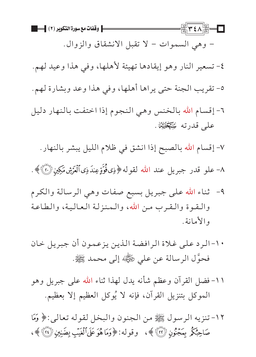 ١٢ - تنزيه الرسول - صلى الله عليه وسلم - من الجنون والبخل لقوله تعالى: {وَمَا صَاحِبُكُمْ بِمَجْنُونٍ (٢٢)}، وقوله: {وَمَا هُوَ عَلَى الْغَيْبِ بِضَنِينٍ (٢٤)}،