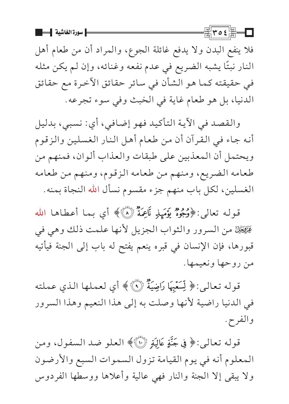 قوله تعالى: {لِسَعْيِهَا رَاضِيَةٌ (٩)} أي لعملها الذي عملته في الدنيا راضية لأنها وصلت به إلى هذا النعيم وهذا السرور والفرح.