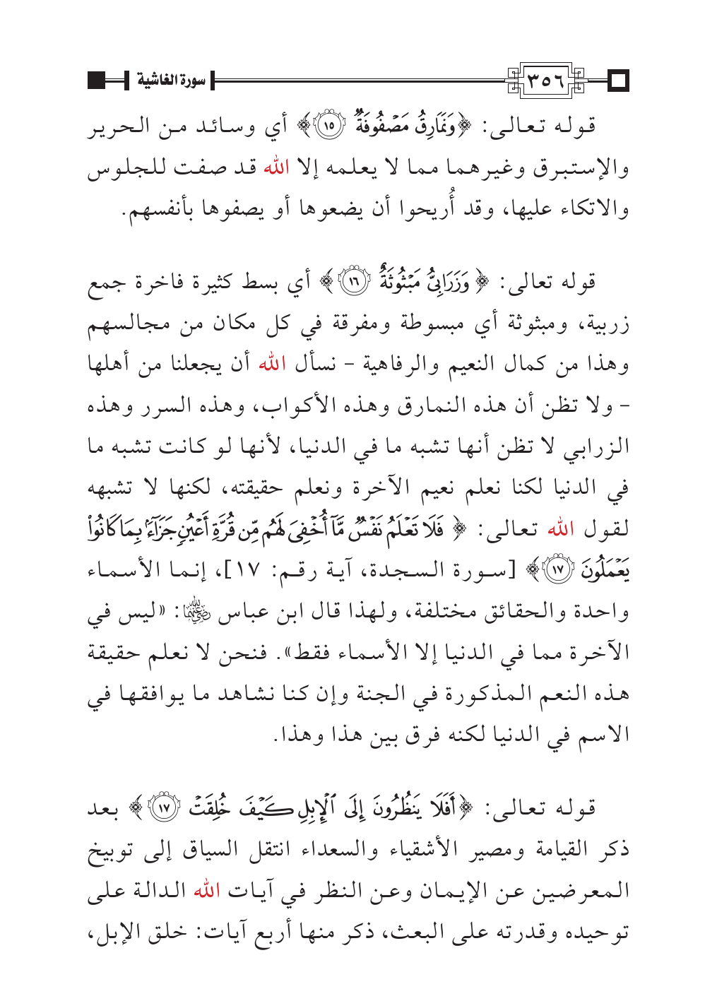 قوله تعالى: {وَزَرَابِيُّ مَبْثُوثَةٌ (١٦)} أي بسط كثيرة فاخرة جمع زربية، ومبثوثة أي مبسوطة ومفرقة في كل مكان من مجالسهم وهذا من كمال النعيم والرفاهية - نسأل الله أن يجعلنا من أهلها - ولا تظن أن هذه النمارق وهذه الأكواب، وهذه السرر وهذه الزرابي لا تظن أنها تشبه ما في الدنيا، لأنها لو كانت تشبه ما في الدنيا لكنا نعلم نعيم الآخرة ونعلم حقيقته، لكنها لا تشبهه لقول الله تعالى: {فَلَا تَعْلَمُ نَفْسٌ مَا أُخْفِيَ لَهُمْ مِنْ قُرَّةِ أَعْيُنٍ جَزَاءً بِمَا كَانُوا يَعْمَلُونَ (١٧)} [سورة السجدة، آية رقم: ١٧]، إنما الأسماء واحدة والحقائق مختلفة، ولهذا قال ابن عباس - رضي الله عنهما -: «ليس في الآخرة مما في الدنيا إلا الأسماء فقط». فنحن لا نعلم حقيقة هذه النعم المذكورة في الجنة وإن كنا نشاهد ما يوافقها في الاسم في الدنيا لكنه فرق بين هذا وهذا.