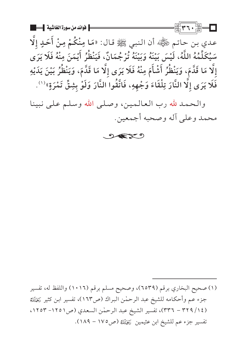 (¬١). صحيح البخاري برقم (٦٥٣٩)، وصحيح مسلم برقم (١٠١٦) واللفظ له، تفسير جزء عم وأحكامه للشيخ عبد الرحمن البراك (ص ١٦٣)، تفسير ابن كثير - رحمه الله - (١٤/ ٣٢٩ - ٣٣٦)، تفسير الشيخ عبد الرحمن السعدي (ص ١٢٥١ - ١٢٥٣، تفسير جزء عم للشيخ ابن عثيمين - رحمه الله - (ص ١٧٥ - ١٨٩).
