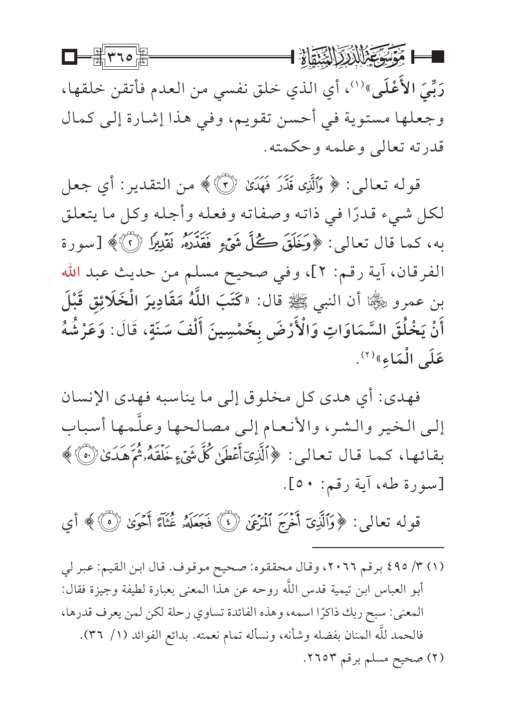 قوله تعالى: {وَالَّذِي قَدَّرَ فَهَدَى (٣)} من التقدير: أي جعل لكل شيء قدرًا في ذاته وصفاته وفعله وأجله وكل ما يتعلق به، كما قال تعالى: {وَخَلَقَ كُلَّ شَيْءٍ فَقَدَّرَهُ تَقْدِيرًا (٢)} [سورة الفرقان، آية رقم: ٢]، وفي صحيح مسلم من حديث عبد الله بن عمرو - رضي الله عنهما - أن النبي - صلى الله عليه وسلم - قال: «كَتَبَ اللَّهُ مَقَادِيرَ الْخَلَائِقِ قَبْلَ أَنْ يَخْلُقَ السَّمَاوَاتِ وَالْأَرْضَ بِخَمْسِينَ أَلْفَ سَنَةٍ، قَالَ: وَعَرْشُهُ عَلَى الْمَاءِ» (¬٢).