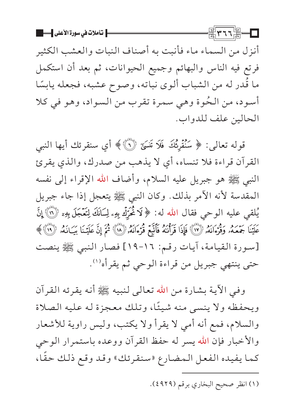وفي الآية بشارة من الله تعالى لنبيه - صلى الله عليه وسلم - أنه يقرئه القرآن ويحفظه ولا ينسى منه شيئًا، وتلك معجزة له عليه الصلاة والسلام، فمع أنه أمي لا يقرأ ولا يكتب، وليس راوية للأشعار والأخبار فإن الله يسر له حفظ القرآن ووعده باستمرار الوحي كما يفيده الفعل المضارع «سنقرئك» وقد وقع ذلك حقًا،
