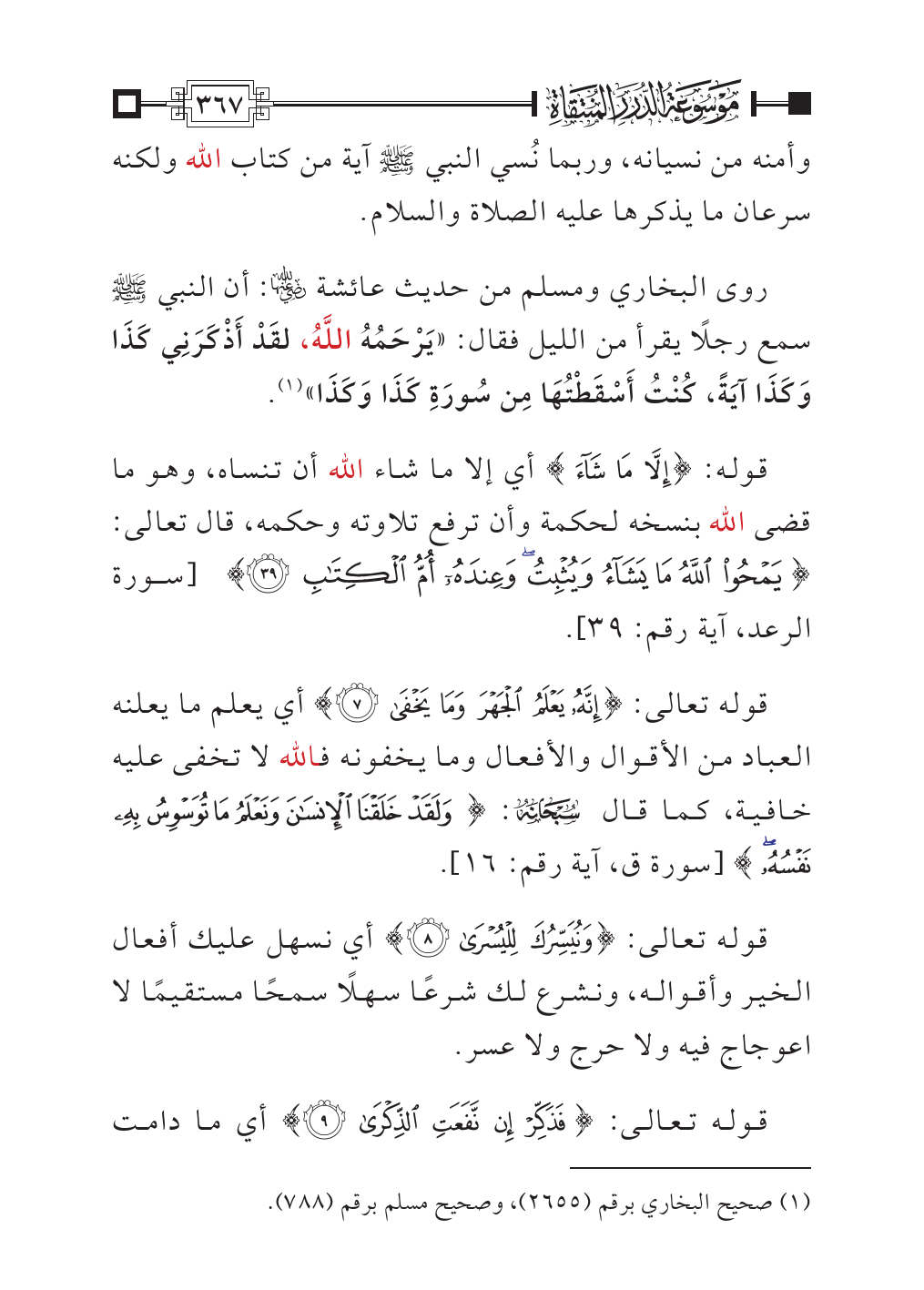 وأمنه من نسيانه، وربما نُسي النبي - صلى الله عليه وسلم - آية من كتاب الله ولكنه سرعان ما يذكرها عليه الصلاة والسلام.