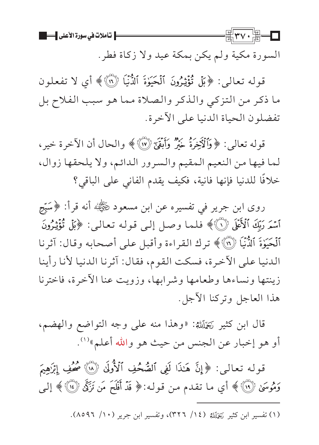 روى ابن جرير في تفسيره عن ابن مسعود - رضي الله عنه - أنه قرأ: {سَبِّحِ اسْمَ رَبِّكَ الْأَعْلَى (١)} فلما وصل إلى قوله تعالى: {بَلْ تُؤْثِرُونَ الْحَيَاةَ الدُّنْيَا (١٦)} ترك القراءة وأقبل على أصحابه وقال: آثرنا الدنيا على الآخرة، فسكت القوم، فقال: آثرنا الدنيا لأنا رأينا زينتها ونساءها وطعامها وشرابها، وزويت عنا الآخرة، فاخترنا هذا العاجل وتركنا الآجل.