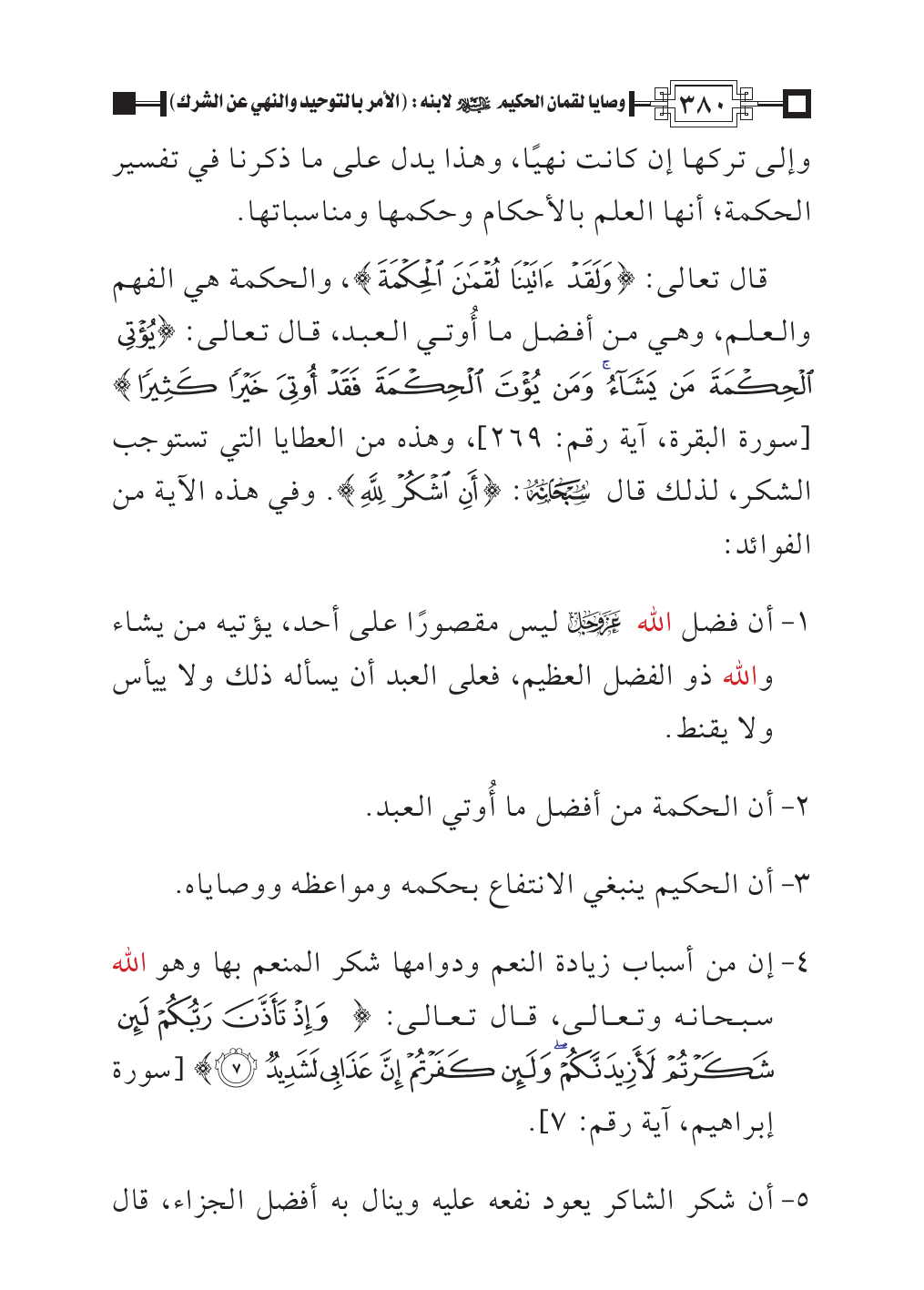 قال تعالى: {وَلَقَدْ آتَيْنَا لُقْمَانَ الْحِكْمَةَ}، والحكمة هي الفهم والعلم، وهي من أفضل ما أُوتي العبد، قال تعالى: {يُؤْتِي الْحِكْمَةَ مَنْ يَشَاءُ وَمَنْ يُؤْتَ الْحِكْمَةَ فَقَدْ أُوتِيَ خَيْرًا كَثِيرًا} [سورة البقرة، آية رقم: ٢٦٩]، وهذه من العطايا التي تستوجب الشكر، لذلك قال - سُبْحَانَهُ -: {أَنِ اشْكُرْ لِلَّهِ}. وفي هذه الآية من الفوائد: