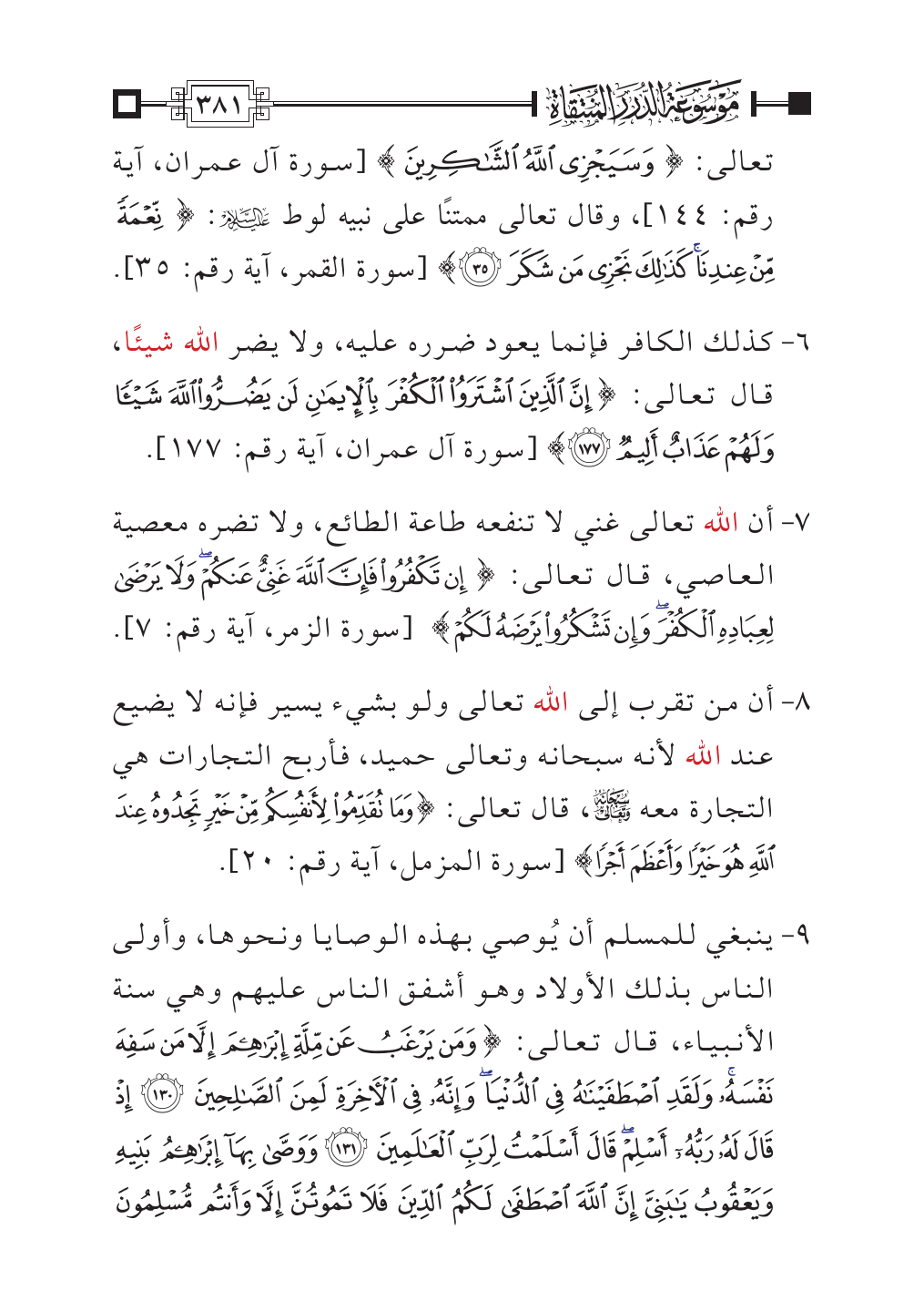 ٩ - ينبغي للمسلم أن يُوصي بهذه الوصايا ونحوها، وأولى الناس بذلك الأولاد وهو أشفق الناس عليهم وهي سنة الأنبياء، قال تعالى: {وَمَنْ يَرْغَبُ عَنْ مِلَّةِ إِبْرَاهِيمَ إِلَّا مَنْ سَفِهَ نَفْسَهُ وَلَقَدِ اصْطَفَيْنَاهُ فِي الدُّنْيَا وَإِنَّهُ فِي الْآخِرَةِ لَمِنَ الصَّالِحِينَ (١٣٠) إِذْ قَالَ لَهُ رَبُّهُ أَسْلِمْ قَالَ أَسْلَمْتُ لِرَبِّ الْعَالَمِينَ (١٣١) وَوَصَّى بِهَا إِبْرَاهِيمُ بَنِيهِ وَيَعْقُوبُ يَابَنِيَّ إِنَّ اللَّهَ اصْطَفَى لَكُمُ الدِّينَ فَلَا تَمُوتُنَّ إِلَّا وَأَنْتُمْ مُسْلِمُونَ