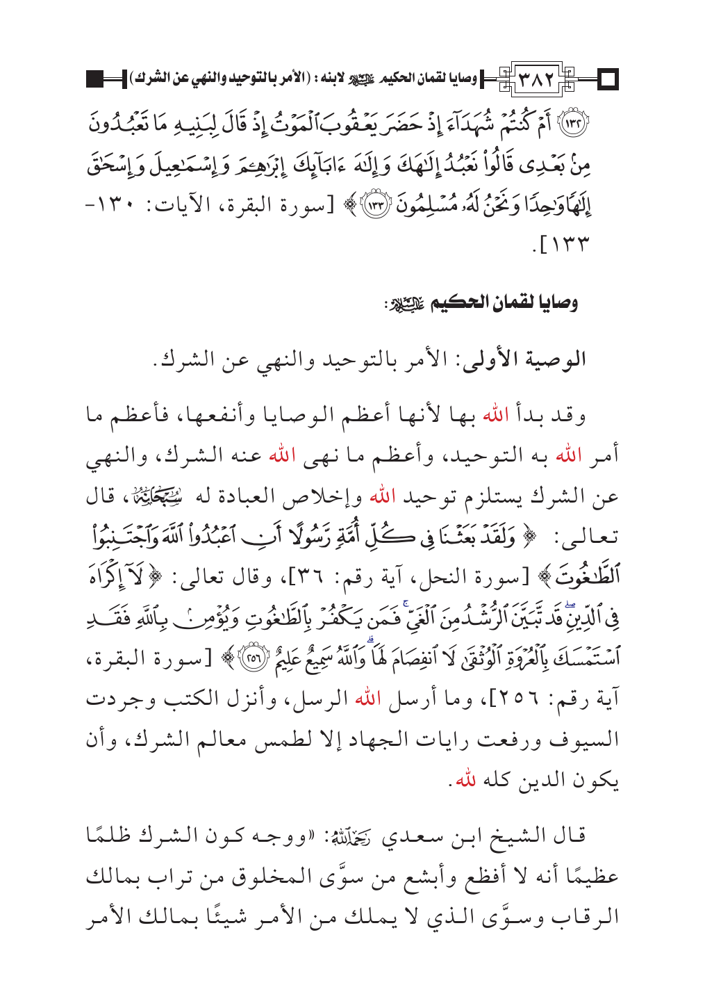 وقد بدأ الله بها لأنها أعظم الوصايا وأنفعها، فأعظم ما أمر الله به التوحيد، وأعظم ما نهى الله عنه الشرك، والنهي عن الشرك يستلزم توحيد الله وإخلاص العبادة له - سُبْحَانَهُ -، قال تعالى: {وَلَقَدْ بَعَثْنَا فِي كُلِّ أُمَّةٍ رَسُولًا أَنِ اعْبُدُوا اللَّهَ وَاجْتَنِبُوا الطَّاغُوتَ} [سورة النحل، آية رقم: ٣٦]، وقال تعالى: {لَا إِكْرَاهَ فِي الدِّينِ قَدْ تَبَيَّنَ الرُّشْدُ مِنَ الْغَيِّ فَمَنْ يَكْفُرْ بِالطَّاغُوتِ وَيُؤْمِنْ بِاللَّهِ فَقَدِ اسْتَمْسَكَ بِالْعُرْوَةِ الْوُثْقَى لَا انْفِصَامَ لَهَا وَاللَّهُ سَمِيعٌ عَلِيمٌ (٢٥٦)} [سورة البقرة، آية رقم: ٢٥٦]، وما أرسل الله الرسل، وأنزل الكتب وجردت السيوف ورفعت رايات الجهاد إلا لطمس معالم الشرك، وأن يكون الدين كله لله.