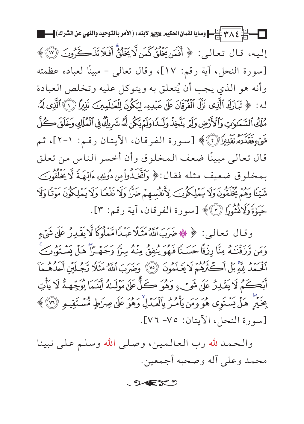 إليه، قال تعالى: {أَفَمَنْ يَخْلُقُ كَمَنْ لَا يَخْلُقُ أَفَلَا تَذَكَّرُونَ (١٧)} [سورة النحل، آية رقم: ١٧]، وقال تعالى - مبينًا لعباده عظمته وأنه هو الذي يجب أن يُتعلق به ويتوكل عليه وتخلص العبادة له: {تَبَارَكَ الَّذِي نَزَّلَ الْفُرْقَانَ عَلَى عَبْدِهِ لِيَكُونَ لِلْعَالَمِينَ نَذِيرًا (١) الَّذِي لَهُ مُلْكُ السَّمَاوَاتِ وَالْأَرْضِ وَلَمْ يَتَّخِذْ وَلَدًا وَلَمْ يَكُنْ لَهُ شَرِيكٌ فِي الْمُلْكِ وَخَلَقَ كُلَّ شَيْءٍ فَقَدَّرَهُ تَقْدِيرًا (٢)} [سورة الفرقان، الآيتان رقم: ١ - ٢]، ثم قال تعالى مبينًا ضعف المخلوق وأن أخسر الناس من تعلق بمخلوق ضعيف مثله فقال: {وَاتَّخَذُوا مِنْ دُونِهِ آلِهَةً لَا يَخْلُقُونَ شَيْئًا وَهُمْ يُخْلَقُونَ وَلَا يَمْلِكُونَ لِأَنْفُسِهِمْ ضَرًّا وَلَا نَفْعًا وَلَا يَمْلِكُونَ مَوْتًا وَلَا حَيَاةً وَلَا نُشُورًا (٣)} [سورة الفرقان، آية رقم: ٣].