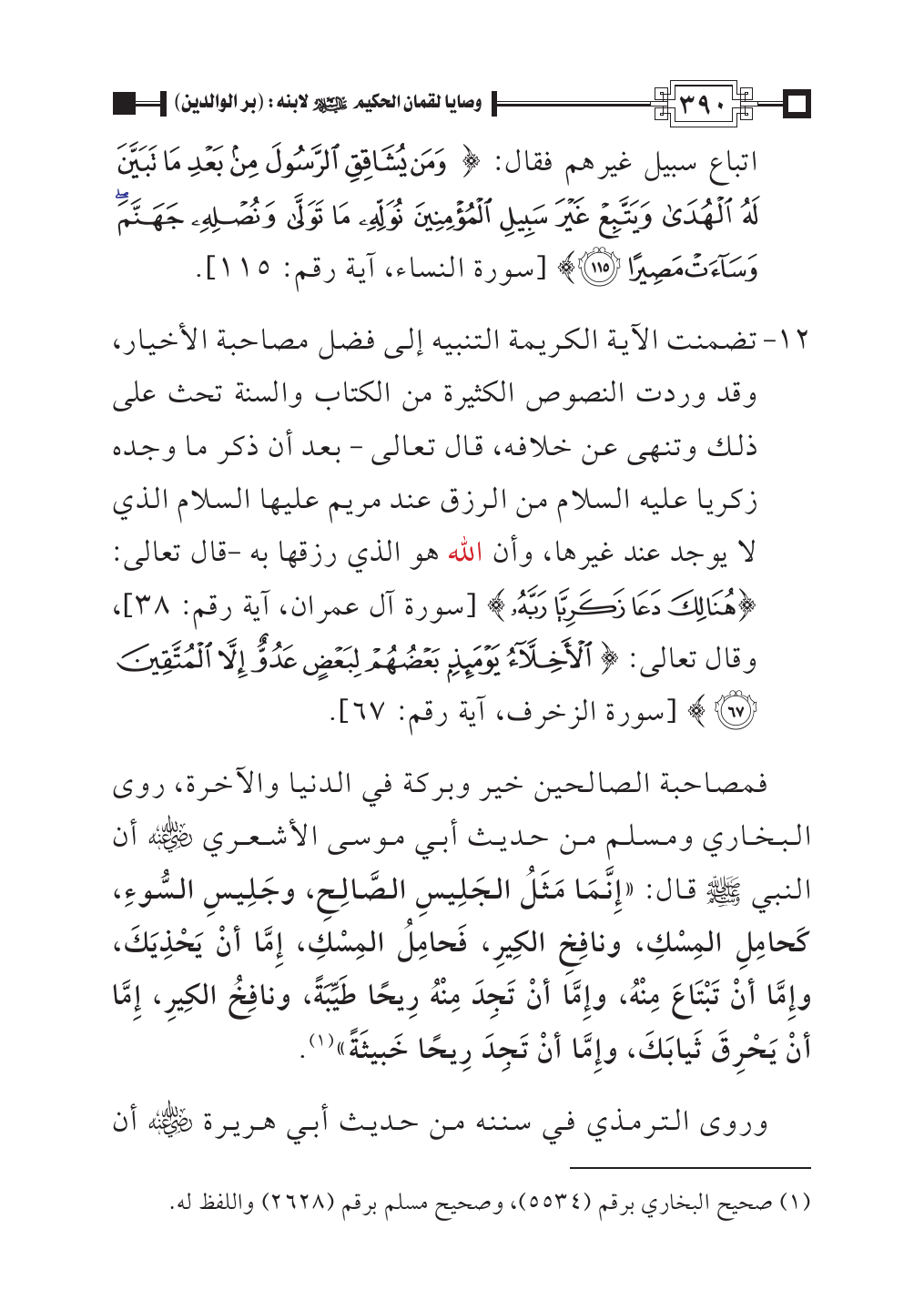 فمصاحبة الصالحين خير وبركة في الدنيا والآخرة، روى البخاري ومسلم من حديث أبي موسى الأشعري - رضي الله عنه - أن النبي - صلى الله عليه وسلم - قال: «إِنَّمَا مَثَلُ الجَلِيسِ الصَّالِحِ، وجَلِيسِ السُّوءِ، كَحامِلِ المِسْكِ، ونافِخِ الكِيرِ، فَحامِلُ المِسْكِ، إِمَّا أنْ يَحْذِيَكَ، وإِمَّا أنْ تَبْتَاعَ مِنْهُ، وإِمَّا أنْ تَجِدَ مِنْهُ رِيحًا طَيِّبَةً، ونافِخُ الكِيرِ، إِمَّا أنْ يَحْرِقَ ثَيابَكَ، وإِمَّا أنْ تَجِدَ رِيحًا خَبيثَةً» (¬١).