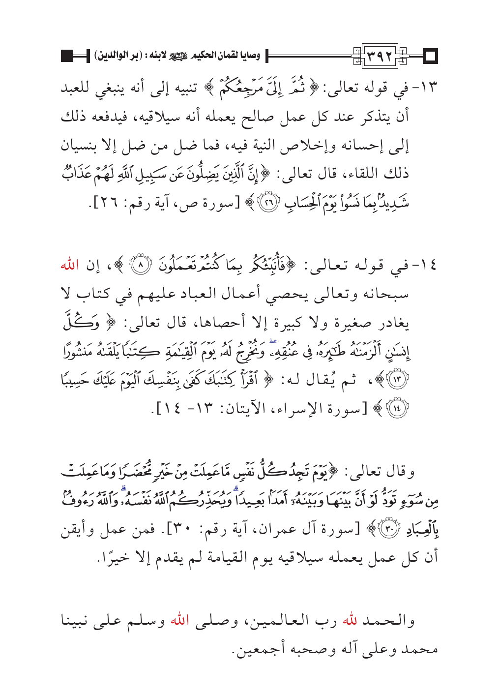 ١٣ - في قوله تعالى: {ثُمَّ إِلَيَّ مَرْجِعُكُمْ} تنبيه إلى أنه ينبغي للعبد أن يتذكر عند كل عمل صالح يعمله أنه سيلاقيه، فيدفعه ذلك إلى إحسانه وإخلاص النية فيه، فما ضل من ضل إلا بنسيان ذلك اللقاء، قال تعالى: {إِنَّ الَّذِينَ يَضِلُّونَ عَنْ سَبِيلِ اللَّهِ لَهُمْ عَذَابٌ شَدِيدٌ بِمَا نَسُوا يَوْمَ الْحِسَابِ (٢٦)} [سورة ص، آية رقم: ٢٦].