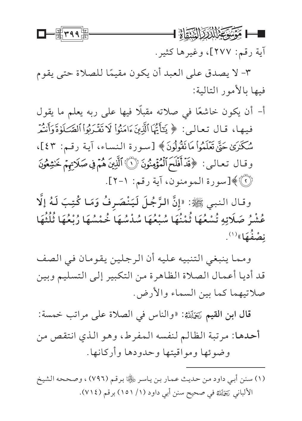 ٣ - لا يصدق على العبد أن يكون مقيمًا للصلاة حتى يقوم فيها بالأمور التالية: