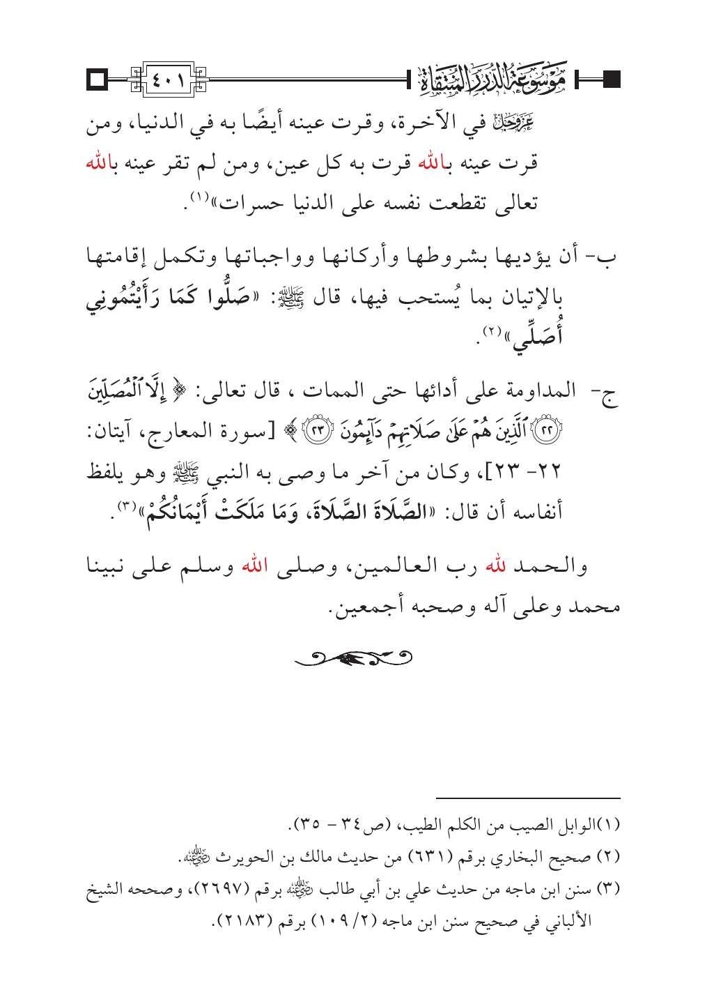 ج- المداومة على أدائها حتى الممات، قال تعالى: {إِلَّا الْمُصَلِّينَ (٢٢) الَّذِينَ هُمْ عَلَى صَلَاتِهِمْ دَائِمُونَ (٢٣)} [سورة المعارج، آيتان: ٢٢ - ٢٣]، وكان من آخر ما وصى به النبي - صلى الله عليه وسلم - وهو يلفظ أنفاسه أن قال: «الصَّلَاةَ الصَّلَاةَ، وَمَا مَلَكَتْ أَيْمَانُكُمْ» (¬٣).