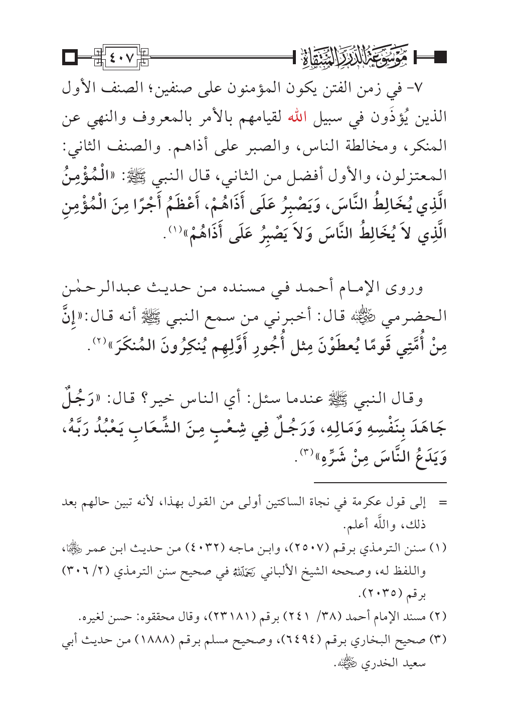 ٧ - في زمن الفتن يكون المؤمنون على صنفين؛ الصنف الأول الذين يُؤذَون في سبيل الله لقيامهم بالأمر بالمعروف والنهي عن المنكر، ومخالطة الناس، والصبر على أذاهم. والصنف الثاني: المعتزلون، والأول أفضل من الثاني، قال النبي - صلى الله عليه وسلم -: «الْمُؤْمِنُ الَّذِي يُخَالِطُ النَّاسَ، وَيَصْبِرُ عَلَى أَذَاهُمْ، أَعْظَمُ أَجْرًا مِنَ الْمُؤْمِنِ الَّذِي لَا يُخَالِطُ النَّاسَ وَلَا يَصْبِرُ عَلَى أَذَاهُمْ» (¬١).