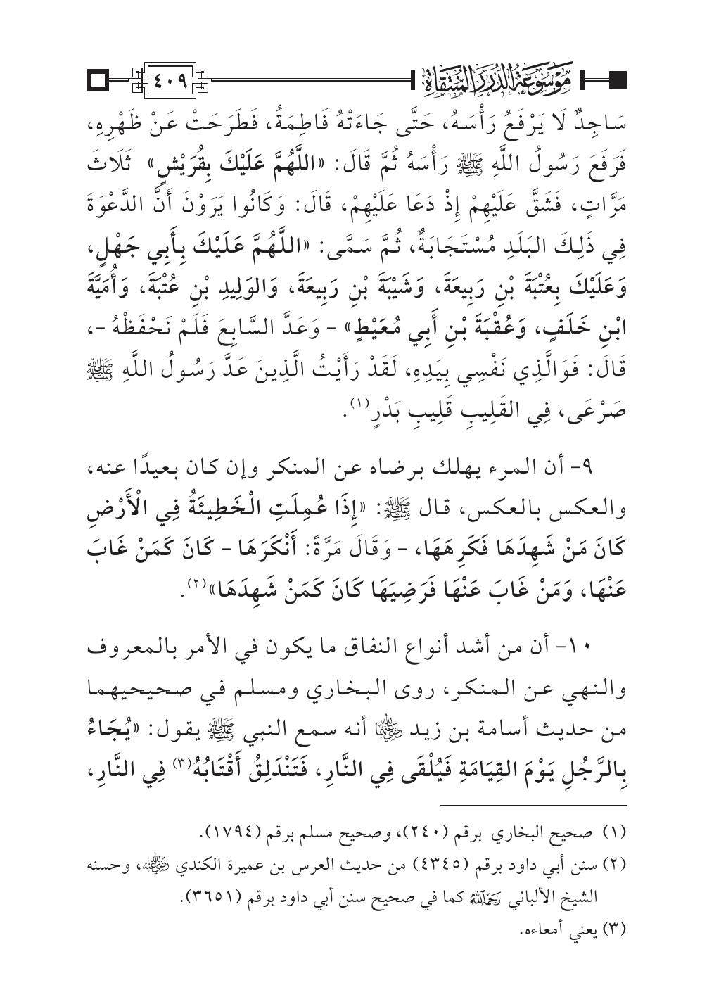 ١٠ - أن من أشد أنواع النفاق ما يكون في الأمر بالمعروف والنهي عن المنكر، روى البخاري ومسلم في صحيحيهما من حديث أسامة بن زيد - رضي الله عنهما - أنه سمع النبي - صلى الله عليه وسلم - يقول: «يُجَاءُ بِالرَّجُلِ يَوْمَ القِيَامَةِ فَيُلْقَى فِي النَّارِ، فَتَنْدَلِقُ أَقْتَابُهُ (¬٣) فِي النَّارِ،
