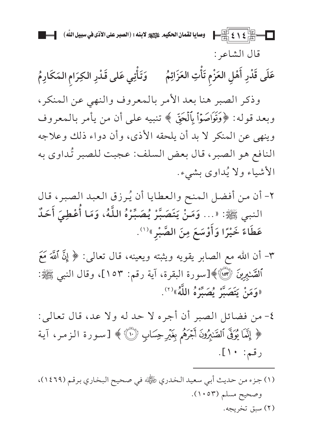 وذكر الصبر هنا بعد الأمر بالمعروف والنهي عن المنكر، وبعد قوله: {وَتَوَاصَوْا بِالْحَقِّ} تنبيه على أن من يأمر بالمعروف وينهى عن المنكر لا بد أن يلحقه الأذى، وأن دواء ذلك وعلاجه النافع هو الصبر، قال بعض السلف: عجبت للصبر تُداوى به الأشياء ولا يُداوى بشيء.