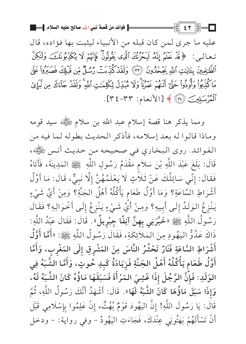 ومما يذكر هنا قصة إسلام عبد الله بن سلام - رضي الله عنه - سيد قومه وماذا قالوا له بعد إسلامه، فأذكر الحديث بطوله لما فيه من الفوائد. روى البخاري في صحيحه من حديث أنس - رضي الله عنه -، قَالَ: بَلَغَ عَبْدَ اللَّهِ بْنَ سَلَامٍ مَقْدَمُ رَسُولِ اللَّهِ - صلى الله عليه وسلم - المَدِينَةَ، فَأَتَاهُ فَقَالَ: إِنِّي سَائِلُكَ عَنْ ثَلَاثٍ لَا يَعْلَمُهُنَّ إِلَّا نَبِيٌّ، قَالَ: مَا أَوَّلُ أَشْرَاطِ السَّاعَةِ؟ وَمَا أَوَّلُ طَعَامٍ يَأْكُلُهُ أَهْلُ الجَنَّةِ؟ وَمِنْ أَيِّ شَيْءٍ يَنْزِعُ الوَلَدُ إِلَى أَبِيهِ؟ وَمِنْ أَيِّ شَيْءٍ يَنْزِعُ إِلَى أَخْوَالِهِ؟ فَقَالَ رَسُولُ اللَّهِ - صلى الله عليه وسلم - «خَبَّرَنِي بِهِنَّ آنِفًا جِبْرِيلُ». قَالَ: فَقَالَ عَبْدُ اللَّهِ: ذَاكَ عَدُوُّ اليَهُودِ مِنَ المَلَائِكَةِ، فَقَالَ رَسُولُ اللَّهِ - صلى الله عليه وسلم -: «أَمَّا أَوَّلُ أَشْرَاطِ السَّاعَةِ فَنَارٌ تَحْشُرُ النَّاسَ مِنَ المَشْرِقِ إِلَى المَغْرِبِ، وَأَمَّا أَوَّلُ طَعَامٍ يَأْكُلُهُ أَهْلُ الجَنَّةِ فَزِيَادَةُ كَبِدِ حُوتٍ، وَأَمَّا الشَّبَهُ فِي الوَلَدِ: فَإِنَّ الرَّجُلَ إِذَا غَشِيَ المَرْأَةَ فَسَبَقَهَا مَاؤُهُ كَانَ الشَّبَهُ لَهُ، وَإِذَا سَبَقَ مَاؤُهَا كَانَ الشَّبَهُ لَهَا». قَالَ: أَشْهَدُ أَنَّكَ رَسُولُ اللَّهِ، ثُمَّ قَالَ: يَا رَسُولَ اللَّهِ! إِنَّ اليَهُودَ قَوْمٌ بُهُتٌ، إِنْ عَلِمُوا بِإِسْلَامِي قَبْلَ أَنْ تَسْأَلَهُمْ بَهَتُونِي عِنْدَكَ، فَجَاءَتِ اليَهُودُ - وفي رواية: - ودخل
