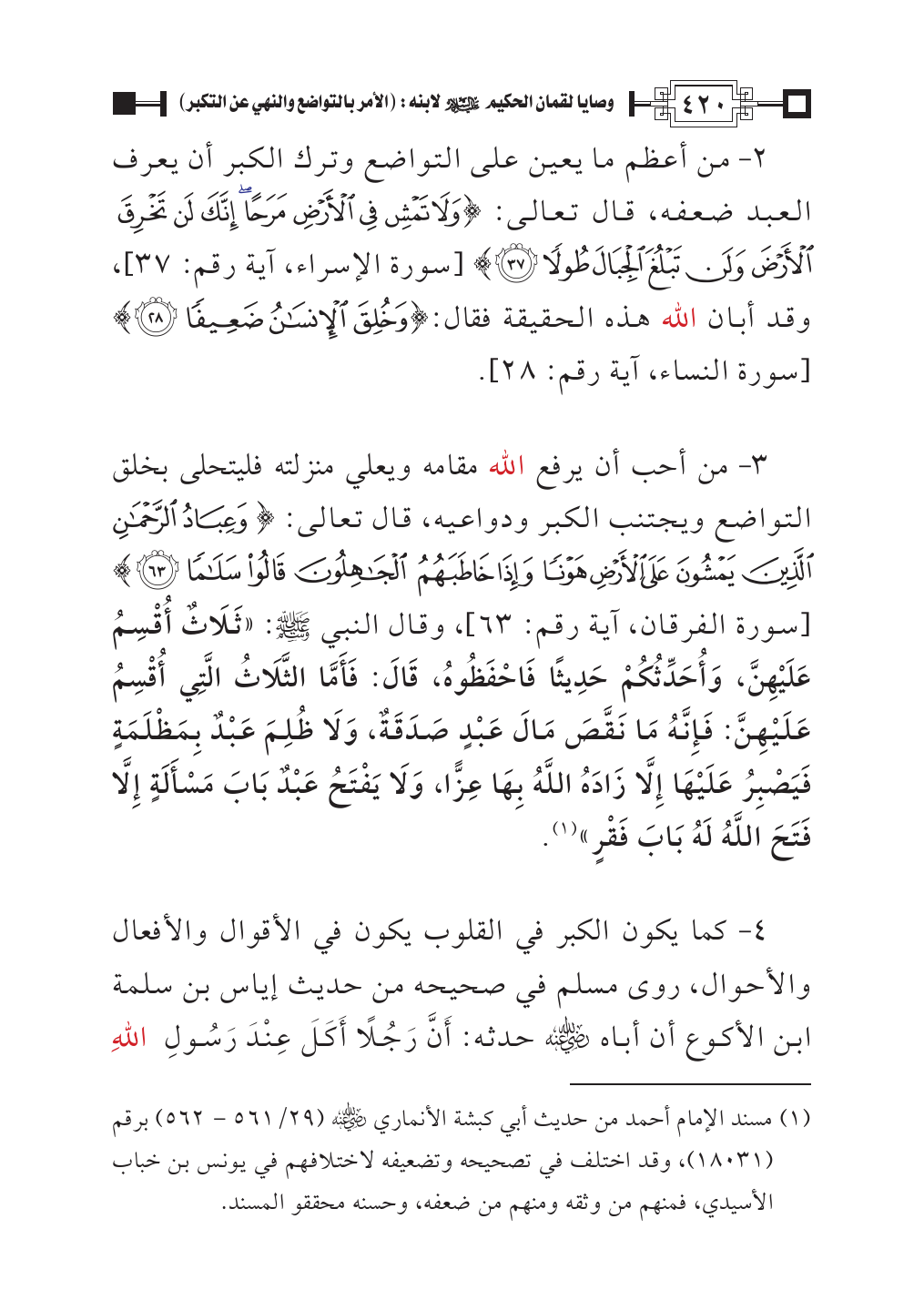٣ - من أحب أن يرفع الله مقامه ويعلي منزلته فليتحلى بخلق التواضع ويجتنب الكبر ودواعيه، قال تعالى: {وَعِبَادُ الرَّحْمَنِ الَّذِينَ يَمْشُونَ عَلَى الْأَرْضِ هَوْنًا وَإِذَا خَاطَبَهُمُ الْجَاهِلُونَ قَالُوا سَلَامًا (٦٣)} [سورة الفرقان، آية رقم: ٦٣]، وقال النبي - صلى الله عليه وسلم -: «ثَلَاثٌ أُقْسِمُ عَلَيْهِنَّ، وَأُحَدِّثُكُمْ حَدِيثًا فَاحْفَظُوهُ، قَالَ: فَأَمَّا الثَّلَاثُ الَّتِي أُقْسِمُ عَلَيْهِنَّ: فَإِنَّهُ مَا نَقَّصَ مَالَ عَبْدٍ صَدَقَةٌ، وَلَا ظُلِمَ عَبْدٌ بِمَظْلَمَةٍ فَيَصْبِرُ عَلَيْهَا إِلَّا زَادَهُ اللَّهُ بِهَا عِزًّا، وَلَا يَفْتَحُ عَبْدٌ بَابَ مَسْأَلَةٍ إِلَّا فَتَحَ اللَّهُ لَهُ بَابَ فَقْرٍ» (¬١).