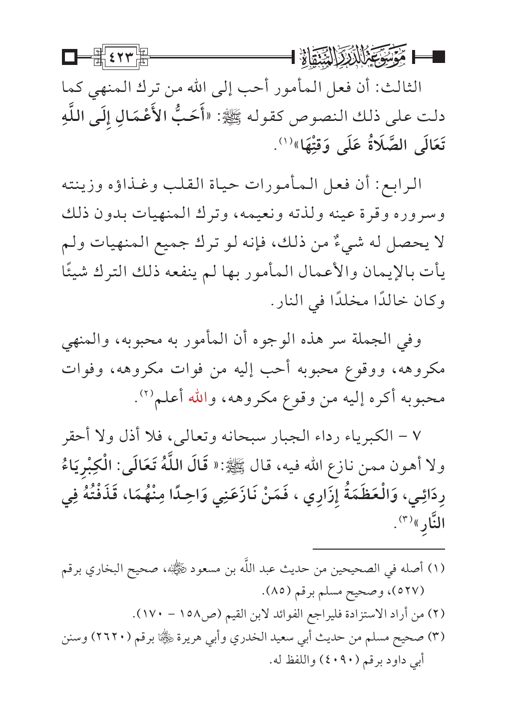 الثالث: أن فعل المأمور أحب إلى الله من ترك المنهي كما دلت على ذلك النصوص كقوله - صلى الله عليه وسلم -: «أَحَبُّ الأَعْمَالِ إِلَى اللَّهِ تَعَالَى الصَّلَاةُ عَلَى وَقْتِهَا» (¬١).