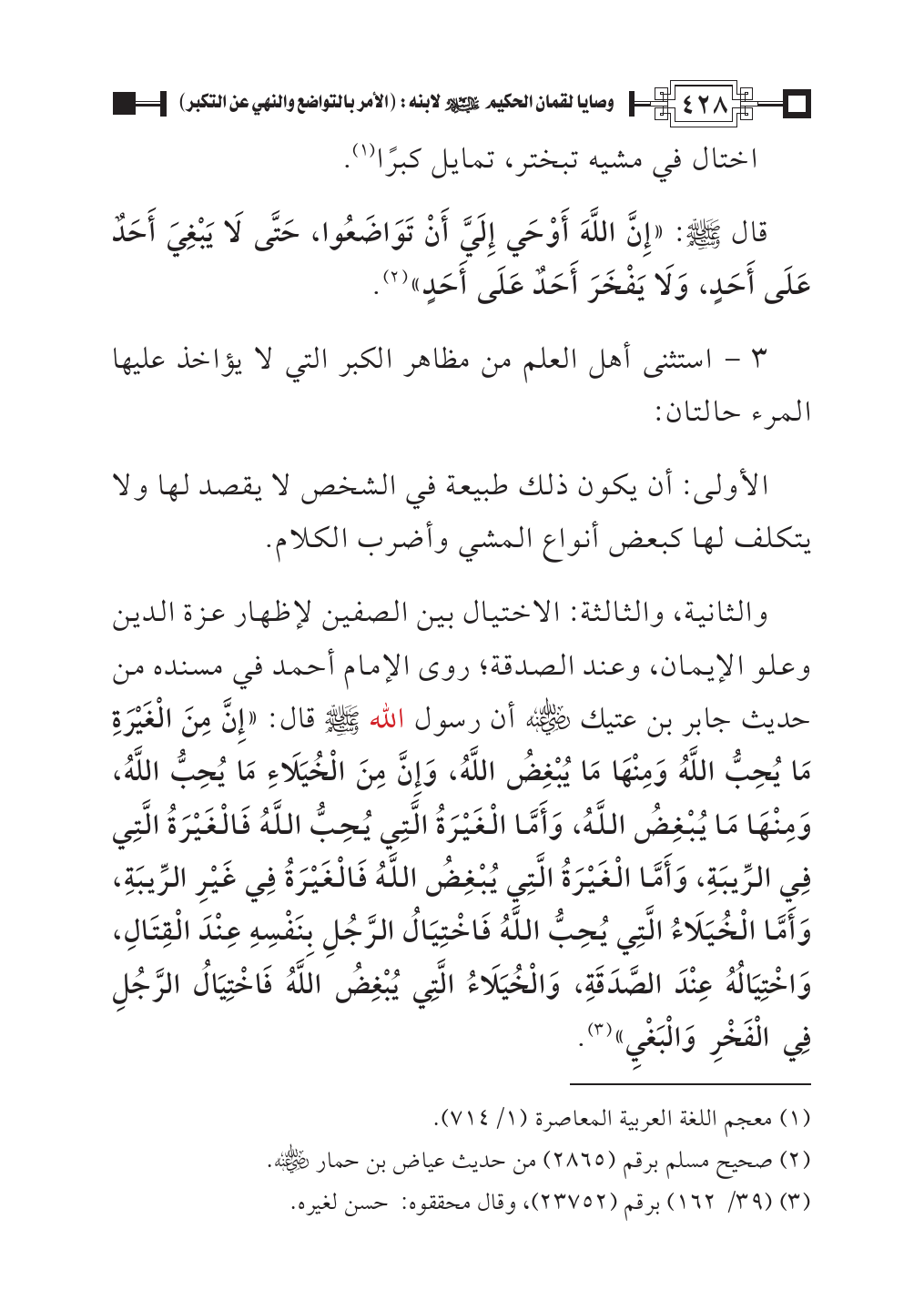 والثانية، والثالثة: الاختيال بين الصفين لإظهار عزة الدين وعلو الإيمان، وعند الصدقة؛ روى الإمام أحمد في مسنده من حديث جابر بن عتيك - رضي الله عنه - أن رسول الله - صلى الله عليه وسلم - قال: «إِنَّ مِنَ الْغَيْرَةِ مَا يُحِبُّ اللَّهُ وَمِنْهَا مَا يُبْغِضُ اللَّهُ، وَإِنَّ مِنَ الْخُيَلَاءِ مَا يُحِبُّ اللَّهُ، وَمِنْهَا مَا يُبْغِضُ اللَّهُ، وَأَمَّا الْغَيْرَةُ الَّتِي يُحِبُّ اللَّهُ فَالْغَيْرَةُ الَّتِي فِي الرِّيبَةِ، وَأَمَّا الْغَيْرَةُ الَّتِي يُبْغِضُ اللَّهُ فَالْغَيْرَةُ فِي غَيْرِ الرِّيبَةِ، وَأَمَّا الْخُيَلَاءُ الَّتِي يُحِبُّ اللَّهُ فَاخْتِيَالُ الرَّجُلِ بِنَفْسِهِ عِنْدَ الْقِتَالِ، وَاخْتِيَالُهُ عِنْدَ الصَّدَقَةِ، وَالْخُيَلَاءُ الَّتِي يُبْغِضُ اللَّهُ فَاخْتِيَالُ الرَّجُلِ فِي الْفَخْرِ وَالْبَغْيِ» (¬٣).