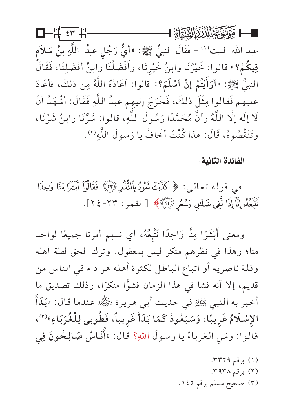 ومعنى أَبَشَرًا مِنَّا وَاحِدًا نَتَّبِعُهُ، أي نسلِم أمرنا جميعًا لواحد منا؛ وهذا في نظرهم منكر ليس بمعقول. وترك الحق لقلة أهله وقلة ناصريه أو اتباع الباطل لكثرة أهله هو داء في الناس من قديم، إلا أنه فشا في هذا الزمان فشوًّا منكرًا، وذلك تصديق ما أخبر به النبي - صلى الله عليه وسلم - في حديث أبي هريرة - عليه السلام - عندما قال: «بَدَأَ الإِسْلَامُ غَرِيبًا، وَسَيَعُودُ كَمَا بَدَأَ غَرِيباً، فَطُوبى لِلْغُرَبَاءِ» (¬٣)، قالوا: ومَنِ الغرباءُ يا رسولَ اللهِ؟ قال: «أُنَاسٌ صَالِحُونَ فِي