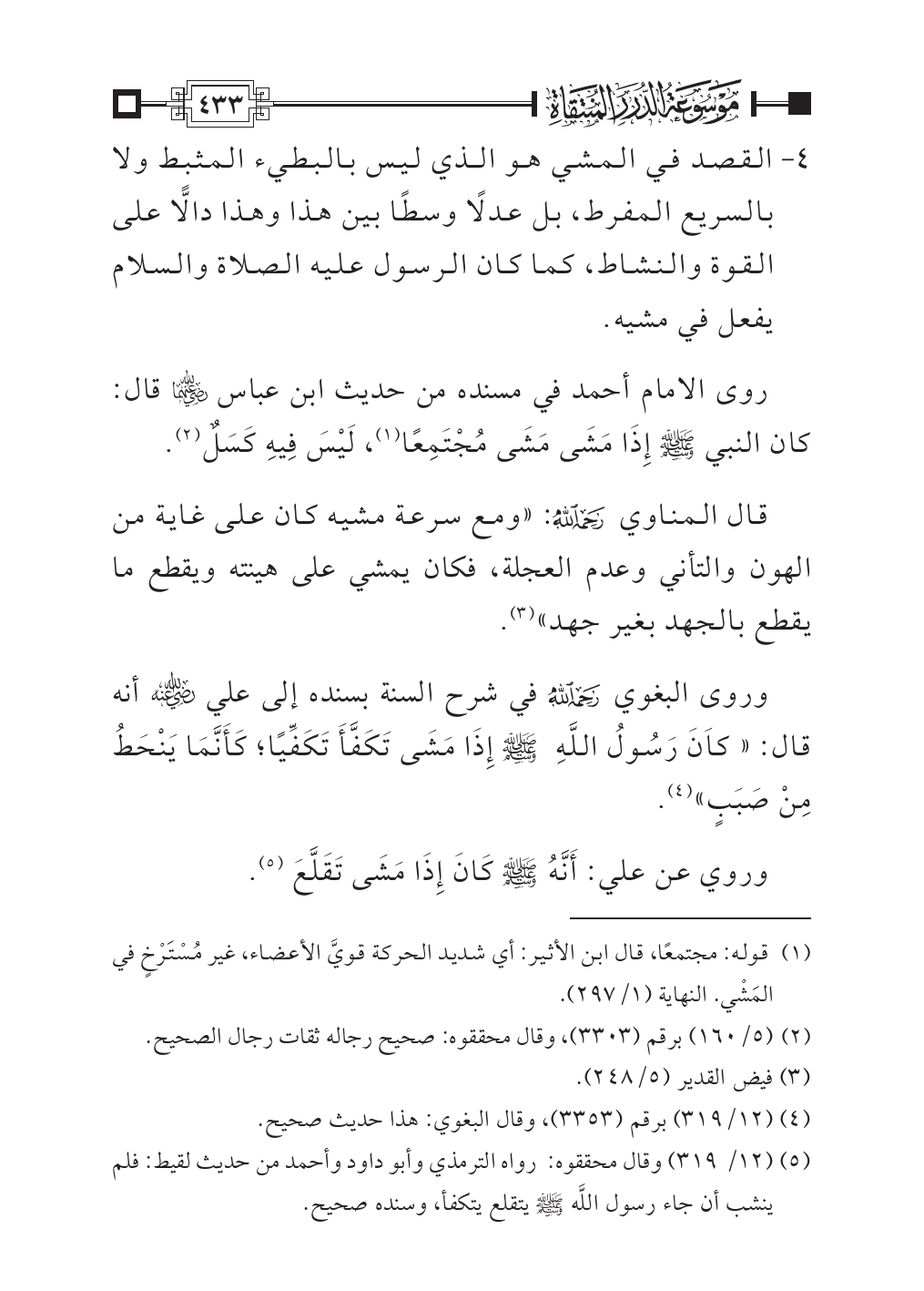 وروى البغوي - رحمه الله - في شرح السنة بسنده إلى علي - رضي الله عنه - أنه قال: «كاَنَ رَسُولُ اللَّهِ - صلى الله عليه وسلم - إِذَا مَشَى تَكَفَّأَ تَكَفِّيًا؛ كَأَنَّمَا يَنْحَطُ مِنْ صَبَبٍ» (¬٤).