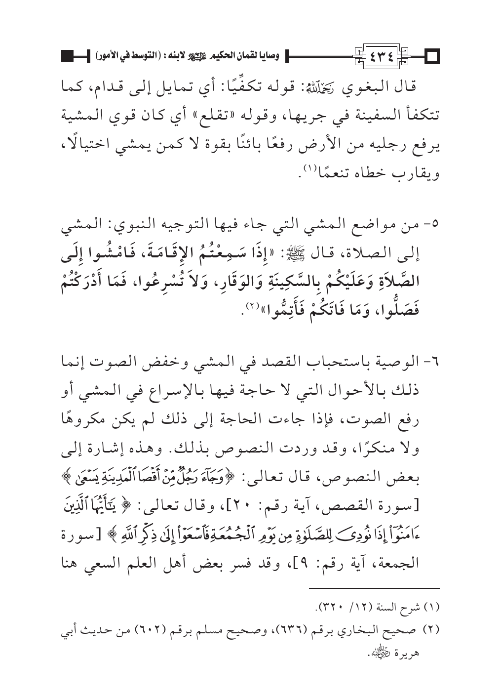 ٦ - الوصية باستحباب القصد في المشي وخفض الصوت إنما ذلك بالأحوال التي لا حاجة فيها بالإسراع في المشي أو رفع الصوت، فإذا جاءت الحاجة إلى ذلك لم يكن مكروهًا ولا منكرًا، وقد وردت النصوص بذلك. وهذه إشارة إلى بعض النصوص، قال تعالى: {وَجَاءَ رَجُلٌ مِنْ أَقْصَى الْمَدِينَةِ يَسْعَى} [سورة القصص، آية رقم: ٢٠]، وقال تعالى: {يَاأَيُّهَا الَّذِينَ آمَنُوا إِذَا نُودِيَ لِلصَّلَاةِ مِنْ يَوْمِ الْجُمُعَةِ فَاسْعَوْا إِلَى ذِكْرِ اللَّهِ} [سورة الجمعة، آية رقم: ٩]، وقد فسر بعض أهل العلم السعي هنا