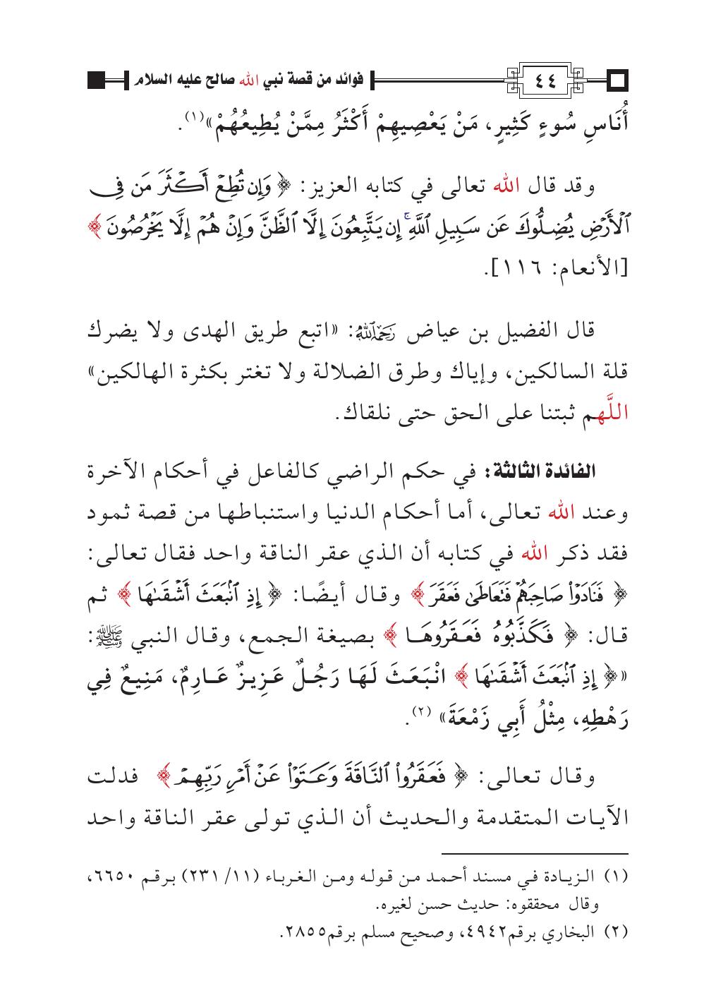 الفائدة الثالثة: في حكم الراضي كالفاعل في أحكام الآخرة وعند الله تعالى، أما أحكام الدنيا واستنباطها من قصة ثمود فقد ذكر الله في كتابه أن الذي عقر الناقة واحد فقال تعالى: {فَنَادَوْا صَاحِبَهُمْ فَتَعَاطَى فَعَقَرَ} وقال أيضًا: {إِذِ انْبَعَثَ أَشْقَاهَا} ثم قال: {فَكَذَّبُوهُ فَعَقَرُوهَا} بصيغة الجمع، وقال النبي - صلى الله عليه وسلم -: «{إِذِ انْبَعَثَ أَشْقَاهَا} انْبَعَثَ لَهَا رَجُلٌ عَزِيزٌ عَارِمٌ، مَنِيعٌ فِي رَهْطِهِ، مِثْلُ أَبِي زَمْعَةَ» (¬٢).