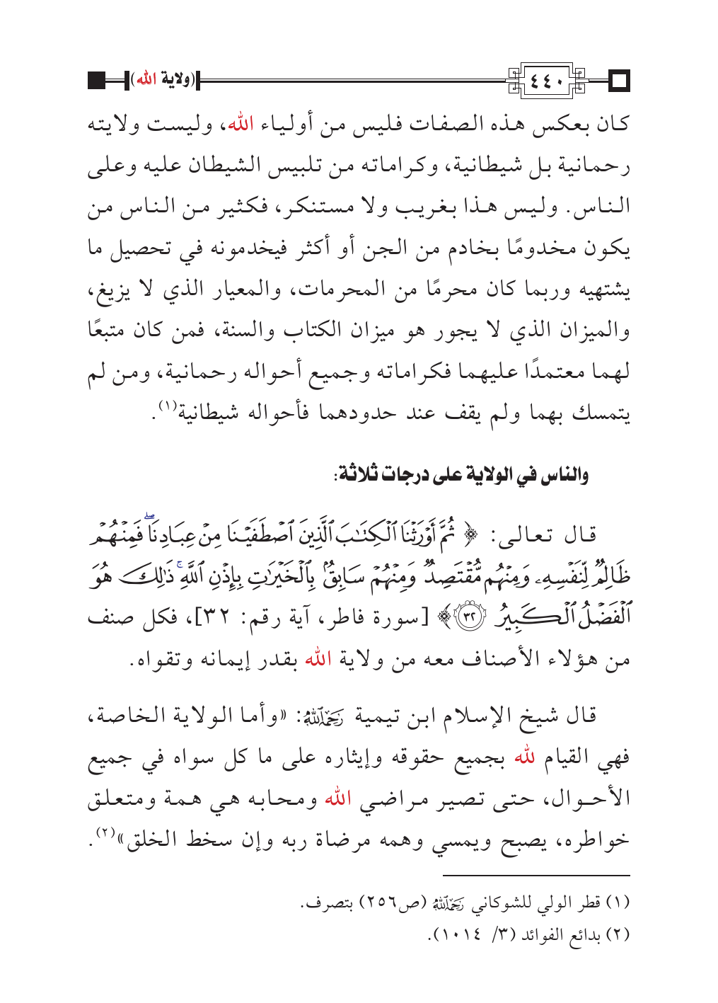 قال تعالى: {ثُمَّ أَوْرَثْنَا الْكِتَابَ الَّذِينَ اصْطَفَيْنَا مِنْ عِبَادِنَا فَمِنْهُمْ ظَالِمٌ لِنَفْسِهِ وَمِنْهُمْ مُقْتَصِدٌ وَمِنْهُمْ سَابِقٌ بِالْخَيْرَاتِ بِإِذْنِ اللَّهِ ذَلِكَ هُوَ الْفَضْلُ الْكَبِيرُ (٣٢)} [سورة فاطر، آية رقم: ٣٢]، فكل صنف من هؤلاء الأصناف معه من ولاية الله بقدر إيمانه وتقواه.