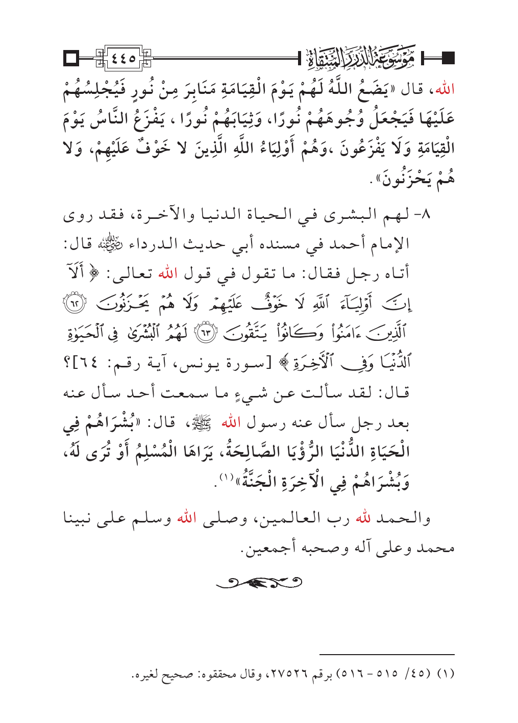 ٨ - لهم البشرى في الحياة الدنيا والآخرة، فقد روى الإمام أحمد في مسنده من حديث أبي الدرداء - رضي الله عنه - قال: أتاه رجل فقال: ما تقول في قول الله تعالى: {أَلَا إِنَّ أَوْلِيَاءَ اللَّهِ لَا خَوْفٌ عَلَيْهِمْ وَلَا هُمْ يَحْزَنُونَ (٦٢) الَّذِينَ آمَنُوا وَكَانُوا يَتَّقُونَ (٦٣) لَهُمُ الْبُشْرَى فِي الْحَيَاةِ الدُّنْيَا وَفِي الْآخِرَةِ} [سورة يونس، آية رقم: ٦٤]؟ قال: لقد سألت عن شيءٍ ما سمعت أحد سأل عنه بعد رجل سأل عنه رسول الله - صلى الله عليه وسلم -، قال: «بُشْرَاهُمْ فِي الْحَيَاةِ الدُّنْيَا الرُّؤْيَا الصَّالِحَةُ، يَرَاهَا الْمُسْلِمُ أَوْ تُرَى لَهُ، وَبُشْرَاهُمْ فِي الْآخِرَةِ الْجَنَّةُ» (¬١).
