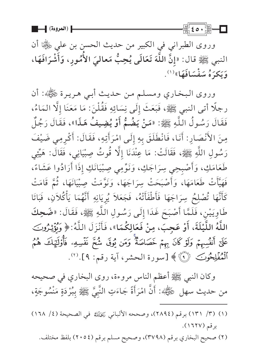 وروى البخاري ومسلم من حديث أبي هريرة - رضي الله عنه -: أن رجلًا أتى النبي - صلى الله عليه وسلم -، فَبَعَثَ إِلَى نِسَائِهِ فَقُلْنَ: مَا مَعَنَا إِلَّا المَاءُ، فَقَالَ رَسُولُ اللَّهِ - صلى الله عليه وسلم -: «مَنْ يَضُمُّ أَوْ يُضِيفُ هَذَا»، فَقَالَ رَجُلٌ مِنَ الأَنْصَارِ: أَنَا، فَانْطَلَقَ بِهِ إِلَى امْرَأَتِهِ، فَقَالَ: أَكْرِمِي ضَيْفَ رَسُولِ اللَّهِ - صلى الله عليه وسلم -، فَقَالَتْ: مَا عِنْدَنَا إِلَّا قُوتُ صِبْيَانِي، فَقَالَ: هَيِّئِي طَعَامَكِ، وَأَصْبِحِي سِرَاجَكِ، وَنَوِّمِي صِبْيَانَكِ إِذَا أَرَادُوا عَشَاءً، فَهَيَّأَتْ طَعَامَهَا، وَأَصْبَحَتْ سِرَاجَهَا، وَنَوَّمَتْ صِبْيَانَهَا، ثُمَّ قَامَتْ كَأَنَّهَا تُصْلِحُ سِرَاجَهَا فَأَطْفَأَتْهُ، فَجَعَلَا يُرِيَانِهِ أَنَّهُمَا يَأْكُلَانِ، فَبَاتَا طَاوِيَيْنِ، فَلَمَّا أَصْبَحَ غَدَا إِلَى رَسُولِ اللَّهِ - صلى الله عليه وسلم -، فَقَالَ: «ضَحِكَ اللَّهُ اللَّيْلَةَ، أَوْ عَجِبَ، مِنْ فَعَالِكُمَا»، فَأَنْزَلَ اللَّهُ: {وَيُؤْثِرُونَ عَلَى أَنْفُسِهِمْ وَلَوْ كَانَ بِهِمْ خَصَاصَةٌ وَمَنْ يُوقَ شُحَّ نَفْسِهِ فَأُولَئِكَ هُمُ الْمُفْلِحُونَ (٩)} [سورة الحشر، آية رقم: ٩]. (¬٢).